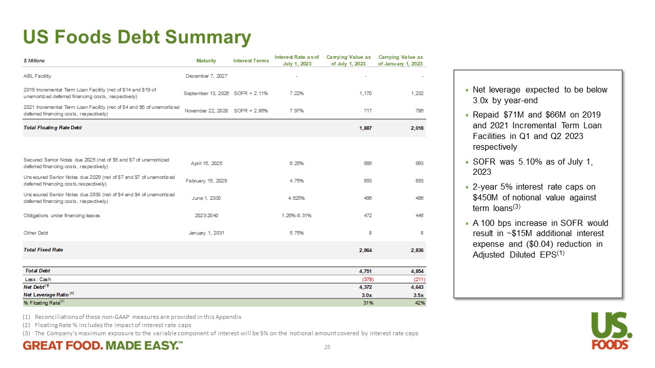 • Net leverage expected to be below 3.0x by year - end • Repaid $71M and $66M on 2019 and 2021 Incremental Term Loan Facilities in Q1 and Q2 2023 respectively • SOFR was 5.10% as of July 1, 2023 • 2 - year 5% interest rate caps on $450M of notional value against term loans (3) • A 100 bps increase in SOFR would result in ~$15M additional interest expense and ($0.04) reduction in Adjusted Diluted EPS (1) US Foods Debt Summary (1) Reconciliations of these non - GAAP measures are provided in this Appendix (2) Floating Rate % includes the impact of interest rate caps (3) The Company's maximum exposure to the variable component of interest will be 5% on the notional amount covered by interest ra te caps $ Millions Maturity Interest Terms Interest Rate as of July 1, 2023 Carrying Value as of July 1, 2023 Carrying Value as of January 1, 2023 ABL Facility December 7, 2027 - - - 2019 Incremental Term Loan Facility (net of $14 and $19 of unamortized deferred financing costs, respectively) September 13, 2026 SOFR + 2.11% 7.22% 1,170 1,232 2021 Incremental Term Loan Facility (net of $4 and $6 of unamortized deferred financing costs, respectively) November 22, 2028 SOFR + 2.86% 7.97% 717 786 Total Floating Rate Debt 1,887 2,018 Secured Senior Notes due 2025 (net of $5 and $7 of unamortized deferred financing costs, respectively) April 15, 2025 6.25% 995 993 Unsecured Senior Notes due 2029 (net of $7 and $7 of unamortized deferred financing costs,respectively) February 15, 2029 4.75% 893 893 Unsecured Senior Notes due 2030 (net of $4 and $4 of unamortized deferred financing costs, respectively) June 1, 2030 4.625% 496 496 Obligations under financing leases 2023-2040 1.26%-8.31% 472 446 Other Debt January 1, 2031 5.75% 8 8 Total Fixed Rate 2,864 2,836 Total Debt 4,751 4,854 Less: Cash (379) (211) Net Debt (1) 4,372 4,643 Net Leverage Ratio (1) 3.0x 3.5x % Floating Rate (2) 31% 42% 25