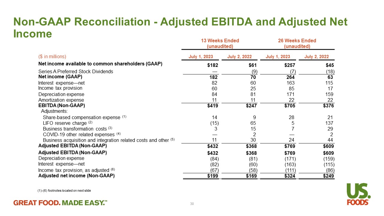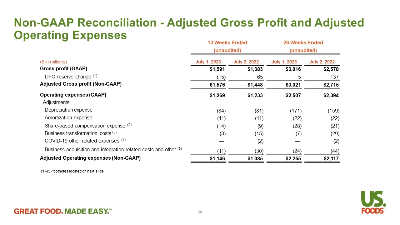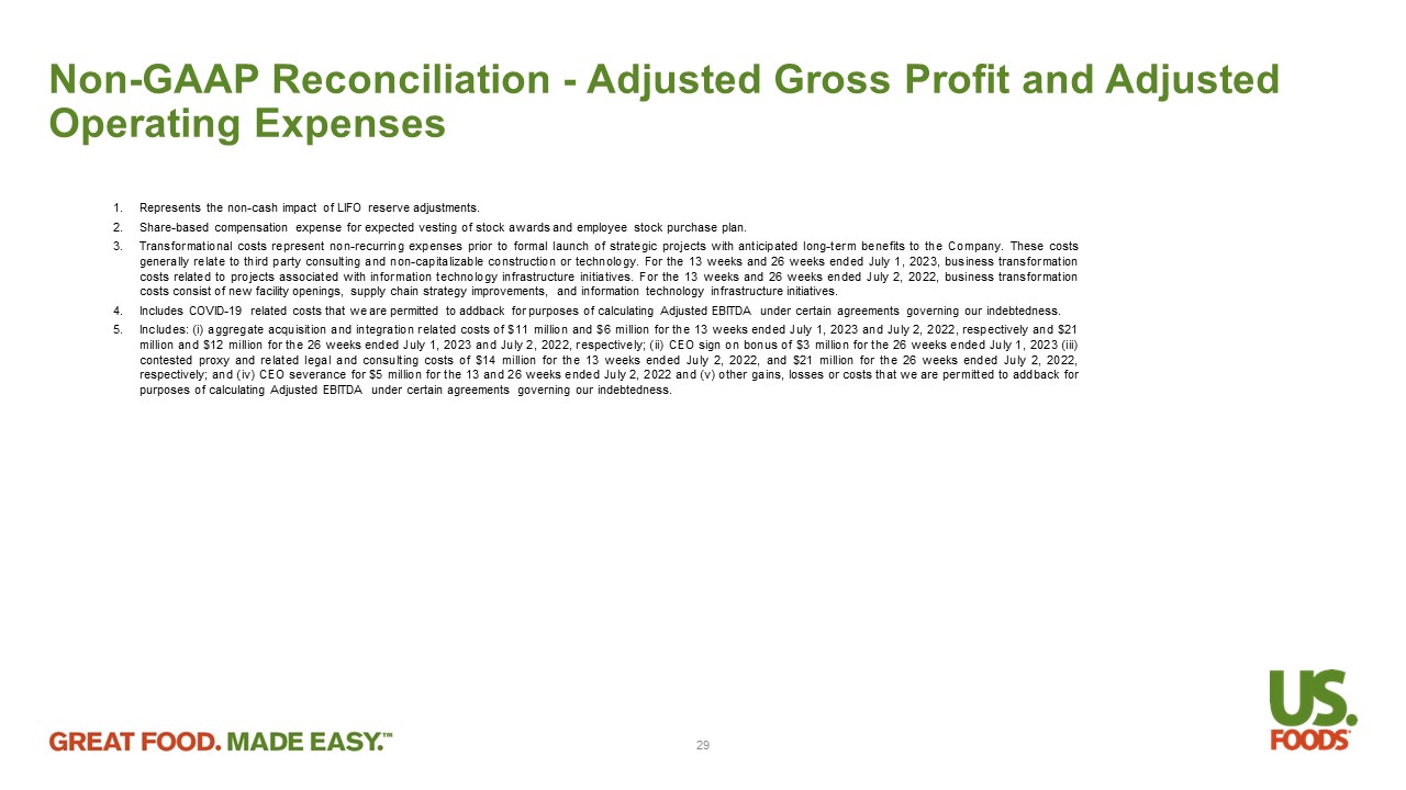 Non - GAAP Reconciliation - Adjusted Gross Profit and Adjusted Operating Expenses 1. Represents the non - cash impact of LIFO reserve adjustments . 2. Share - based compensation expense for expected vesting of stock awards and employee stock purchase plan . 3. Transformational costs represent non - recurring expenses prior to formal launch of strategic projects with anticipated long - term benefits to the Company . These costs generally relate to third party consulting and non - capitalizable construction or technology . For the 13 weeks and 26 weeks ended July 1 , 2023 , business transformation costs related to projects associated with information technology infrastructure initiatives . For the 13 weeks and 26 weeks ended July 2 , 2022 , business transformation costs consist of new facility openings, supply chain strategy improvements, and information technology infrastructure initiatives . 4. Includes COVID - 19 related costs that we are permitted to addback for purposes of calculating Adjusted EBITDA under certain agreements governing our indebtedness . 5. Includes : (i) aggregate acquisition and integration related costs of $ 11 million and $ 6 million for the 13 weeks ended July 1 , 2023 and July 2 , 2022 , respectively and $ 21 million and $ 12 million for the 26 weeks ended July 1 , 2023 and July 2 , 2022 , respectively ; (ii) CEO sign on bonus of $ 3 million for the 26 weeks ended July 1 , 2023 (iii) contested proxy and related legal and consulting costs of $ 14 million for the 13 weeks ended July 2 , 2022 , and $ 21 million for the 26 weeks ended July 2 , 2022 , respectively ; and (iv) CEO severance for $ 5 million for the 13 and 26 weeks ended July 2 , 2022 and (v) other gains, losses or costs that we are permitted to addback for purposes of calculating Adjusted EBITDA under certain agreements governing our indebtedness . 29
