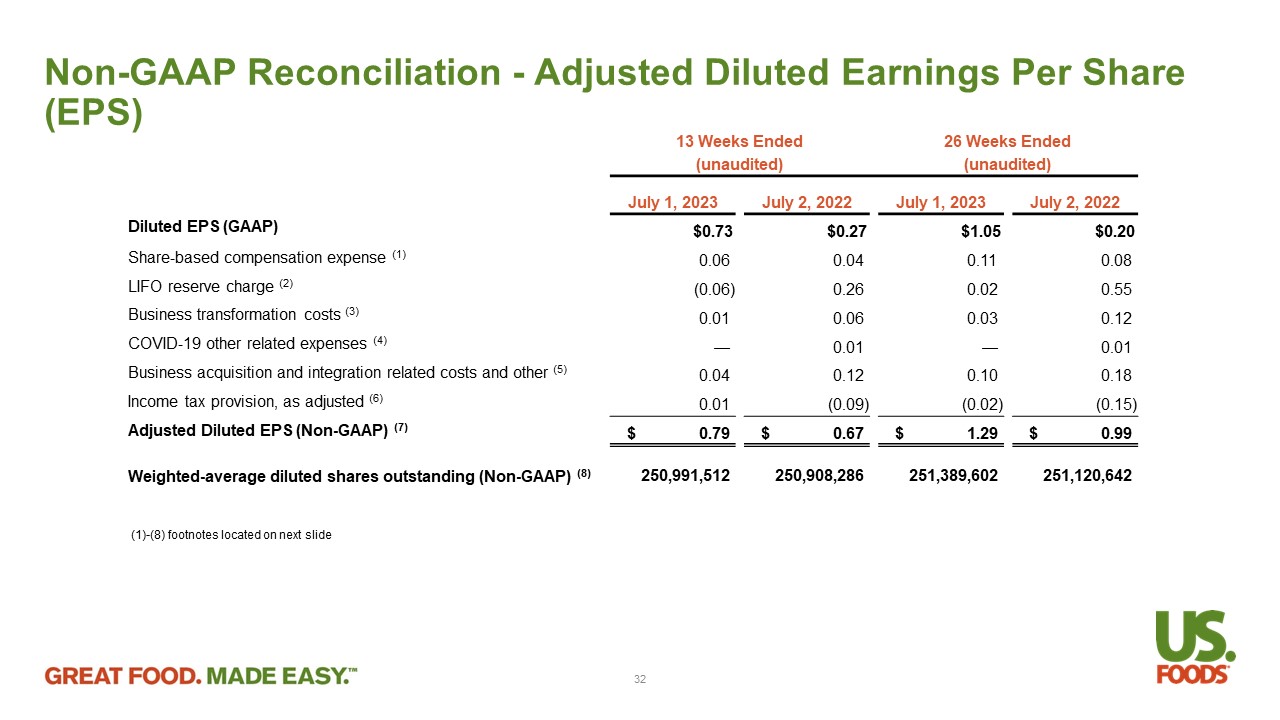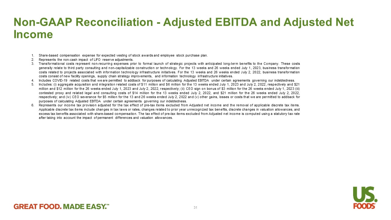 Non - GAAP Reconciliation - Adjusted EBITDA and Adjusted Net Income 1. Share - based compensation expense for expected vesting of stock awards and employee stock purchase plan . 2. Represents the non - cash impact of LIFO reserve adjustments . 3. Transformational costs represent non - recurring expenses prior to formal launch of strategic projects with anticipated long - term benefits to the Company . These costs generally relate to third party consulting and non - capitalizable construction or technology . For the 13 weeks and 26 weeks ended July 1 , 2023 , business transformation costs related to projects associated with information technology infrastructure initiatives . For the 13 weeks and 26 weeks ended July 2 , 2022 , business transformation costs consist of new facility openings, supply chain strategy improvements, and information technology infrastructure initiatives . 4. Includes COVID - 19 related costs that we are permitted to addback for purposes of calculating Adjusted EBITDA under certain agreements governing our indebtedness . 5. Includes : (i) aggregate acquisition and integration related costs of $ 11 million and $ 6 million for the 13 weeks ended July 1 , 2023 and July 2 , 2022 , respectively and $ 21 million and $ 12 million for the 26 weeks ended July 1 , 2023 and July 2 , 2022 , respectively ; (ii) CEO sign on bonus of $ 3 million for the 26 weeks ended July 1 , 2023 (iii) contested proxy and related legal and consulting costs of $ 14 million for the 13 weeks ended July 2 , 2022 , and $ 21 million for the 26 weeks ended July 2 , 2022 , respectively ; and (iv) CEO severance for $ 5 million for the 13 and 26 weeks ended July 2 , 2022 and (v) other gains, losses or costs that we are permitted to addback for purposes of calculating Adjusted EBITDA under certain agreements governing our indebtedness . 6. Represents our income tax provision adjusted for the tax effect of pre - tax items excluded from Adjusted net income and the removal of applicable discrete tax items . Applicable discrete tax items include changes in tax laws or rates, changes related to prior year unrecognized tax benefits, discrete changes in valuation allowances, and excess tax benefits associated with share - based compensation . The tax effect of pre - tax items excluded from Adjusted net income is computed using a statutory tax rate after taking into account the impact of permanent differences and valuation allowances . 31