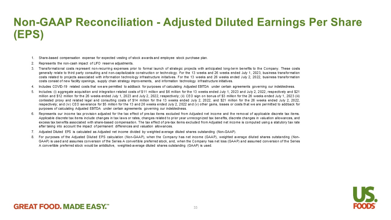Non - GAAP Reconciliation - Adjusted Diluted Earnings Per Share (EPS) 1. Share - based compensation expense for expected vesting of stock awards and employee stock purchase plan . 2. Represents the non - cash impact of LIFO reserve adjustments . 3. Transformational costs represent non - recurring expenses prior to formal launch of strategic projects with anticipated long - term benefits to the Company . These costs generally relate to third party consulting and non - capitalizable construction or technology . For the 13 weeks and 26 weeks ended July 1 , 2023 , business transformation costs related to projects associated with information technology infrastructure initiatives . For the 13 weeks and 26 weeks ended July 2 , 2022 , business transformation costs consist of new facility openings, supply chain strategy improvements, and information technology infrastructure initiatives . 4. Includes COVID - 19 related costs that we are permitted to addback for purposes of calculating Adjusted EBITDA under certain agreements governing our indebtedness . 5. Includes : (i) aggregate acquisition and integration related costs of $ 11 million and $ 6 million for the 13 weeks ended July 1 , 2023 and July 2 , 2022 , respectively and $ 21 million and $ 12 million for the 26 weeks ended July 1 , 2023 and July 2 , 2022 , respectively ; (ii) CEO sign on bonus of $ 3 million for the 26 weeks ended July 1 , 2023 (iii) contested proxy and related legal and consulting costs of $ 14 million for the 13 weeks ended July 2 , 2022 , and $ 21 million for the 26 weeks ended July 2 , 2022 , respectively ; and (iv) CEO severance for $ 5 million for the 13 and 26 weeks ended July 2 , 2022 and (v) other gains, losses or costs that we are permitted to addback for purposes of calculating Adjusted EBITDA under certain agreements governing our indebtedness . 6. Represents our income tax provision adjusted for the tax effect of pre - tax items excluded from Adjusted net income and the removal of applicable discrete tax items . Applicable discrete tax items include changes in tax laws or rates, changes related to prior year unrecognized tax benefits, discrete changes in valuation allowances, and excess tax benefits associated with share - based compensation . The tax effect of pre - tax items excluded from Adjusted net income is computed using a statutory tax rate after taking into account the impact of permanent differences and valuation allowances . 7. Adjusted Diluted EPS is calculated as Adjusted net income divided by weighted average diluted shares outstanding (Non - GAAP) . 8. For purposes of the Adjusted Diluted EPS calculation (Non - GAAP), when the Company has net income (GAAP), weighted average diluted shares outstanding (Non - GAAP) is used and assumes conversion of the Series A convertible preferred stock, and, when the Company has net loss (GAAP) and assumed conversion of the Series A convertible preferred stock would be antidilutive, weighted - average diluted shares outstanding (GAAP) is used . 33