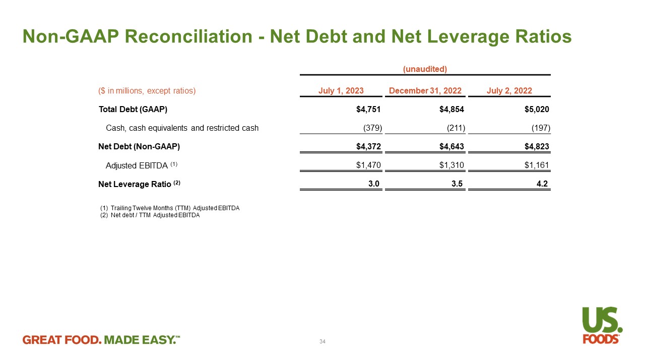 Non - GAAP Reconciliation - Net Debt and Net Leverage Ratios (1) Trailing Twelve Months (TTM) Adjusted EBITDA (2) Net debt / TTM Adjusted EBITDA (unaudited) July 2, 2022 December 31, 2022 July 1, 2023 ($ in millions, except ratios) $5,020 $4,854 $4,751 Total Debt (GAAP) (197) (211) (379) Cash, cash equivalents and restricted cash $4,823 $4,643 $4,372 Net Debt (Non - GAAP) $1,161 $1,310 $1,470 Adjusted EBITDA (1) 4.2 3.5 3.0 Net Leverage Ratio (2) 34