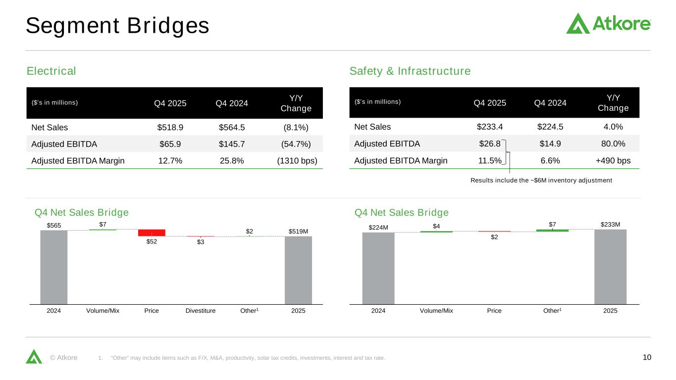 19© Atkore Segment Information Three Months Ended September 30, 2025 September 30, 2024 (in thousands) Net sales Adjusted EBITDA Adjusted EBITDA Margin Net sales Adjusted EBITDA Adjusted EBITDA Margin Electrical $ 518,880 $ 65,947 12.7 % $ 564,535 $ 145,662 25.8 % Safety & Infrastructure 233,409 26,817 11.5 % 224,507 14,898 6.6 % Eliminations (278) (746) Consolidated operations $ 752,011 $ 788,296