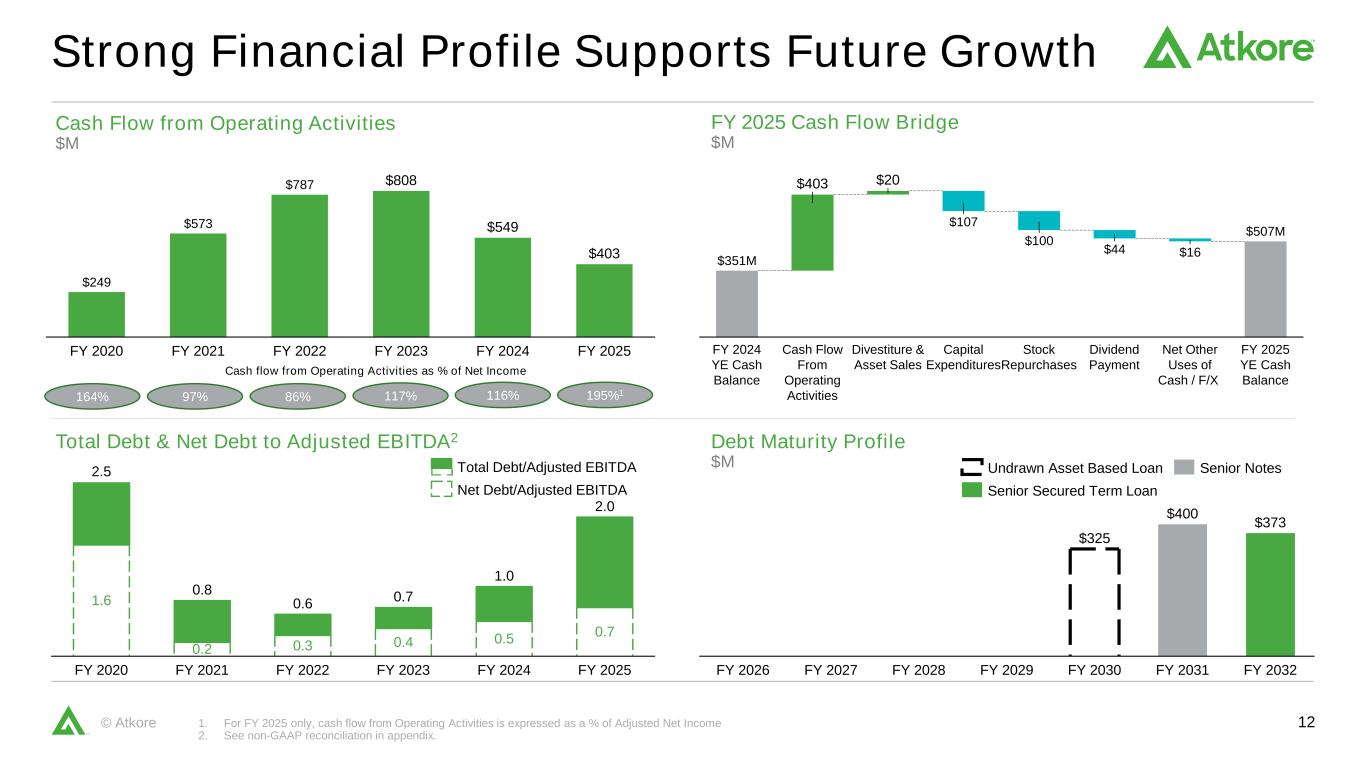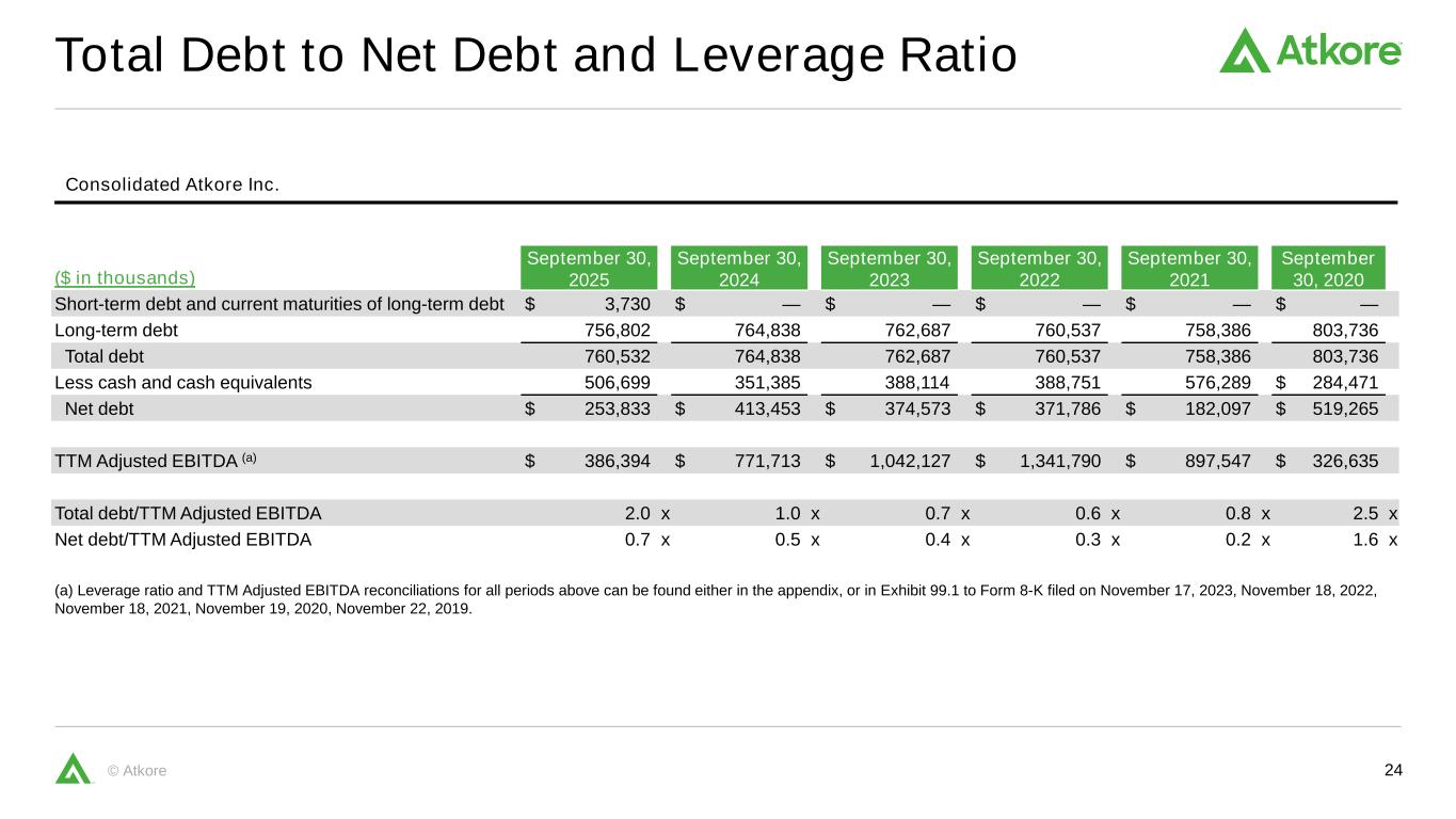 24© Atkore Total Debt to Net Debt and Leverage Ratio Consolidated Atkore Inc. ($ in thousands) September 30, 2025 September 30, 2024 September 30, 2023 September 30, 2022 September 30, 2021 September 30, 2020 Short-term debt and current maturities of long-term debt $ 3,730 $ — $ — $ — $ — $ — Long-term debt 756,802 764,838 762,687 760,537 758,386 803,736 Total debt 760,532 764,838 762,687 760,537 758,386 803,736 Less cash and cash equivalents 506,699 351,385 388,114 388,751 576,289 $ 284,471 Net debt $ 253,833 $ 413,453 $ 374,573 $ 371,786 $ 182,097 $ 519,265 TTM Adjusted EBITDA (a) $ 386,394 $ 771,713 $ 1,042,127 $ 1,341,790 $ 897,547 $ 326,635 Total debt/TTM Adjusted EBITDA 2.0 x 1.0 x 0.7 x 0.6 x 0.8 x 2.5 x Net debt/TTM Adjusted EBITDA 0.7 x 0.5 x 0.4 x 0.3 x 0.2 x 1.6 x (a) Leverage ratio and TTM Adjusted EBITDA reconciliations for all periods above can be found either in the appendix, or in Exhibit 99.1 to Form 8-K filed on November 17, 2023, November 18, 2022, November 18, 2021, November 19, 2020, November 22, 2019.
