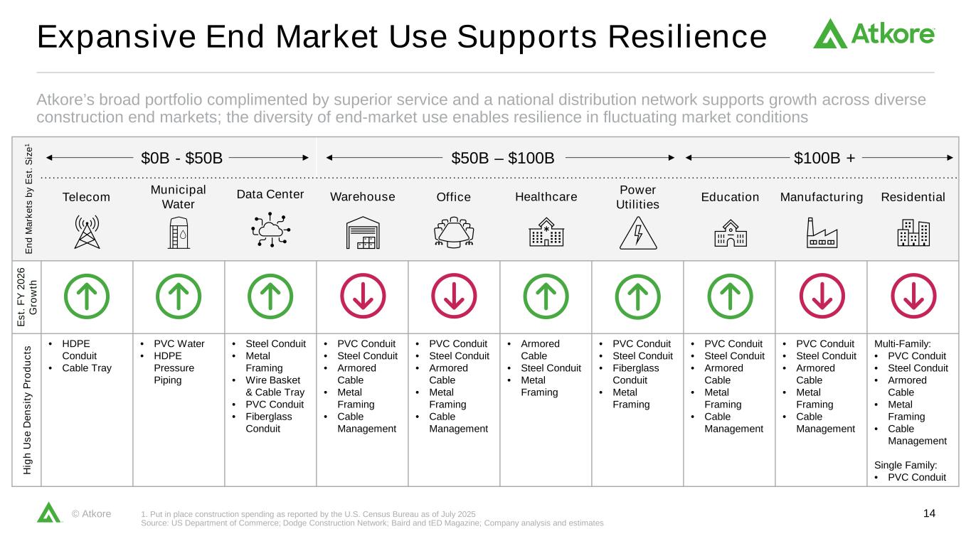 14© Atkore Expansive End Market Use Supports Resilience En d M ar ke ts b y Es t. Si ze 1 $0B - $50B $50B – $100B $100B + Es t. FY 2 02 6 G ro w th H ig h U se D en si ty P ro du ct s • HDPE Conduit • Cable Tray • PVC Water • HDPE Pressure Piping • Steel Conduit • Metal Framing • Wire Basket & Cable Tray • PVC Conduit • Fiberglass Conduit • PVC Conduit • Steel Conduit • Armored Cable • Metal Framing • Cable Management • PVC Conduit • Steel Conduit • Armored Cable • Metal Framing • Cable Management • Armored Cable • Steel Conduit • Metal Framing • PVC Conduit • Steel Conduit • Fiberglass Conduit • Metal Framing • PVC Conduit • Steel Conduit • Armored Cable • Metal Framing • Cable Management • PVC Conduit • Steel Conduit • Armored Cable • Metal Framing • Cable Management Multi-Family: • PVC Conduit • Steel Conduit • Armored Cable • Metal Framing • Cable Management Single Family: • PVC Conduit 1. Put in place construction spending as reported by the U.S. Census Bureau as of July 2025 Source: US Department of Commerce; Dodge Construction Network; Baird and tED Magazine; Company analysis and estimates Atkore’s broad portfolio complimented by superior service and a national distribution network supports growth across diverse construction end markets; the diversity of end-market use enables resilience in fluctuating market conditions Data CenterMunicipal Water Office EducationHealthcare ManufacturingWarehouse ResidentialTelecom Power Utilities