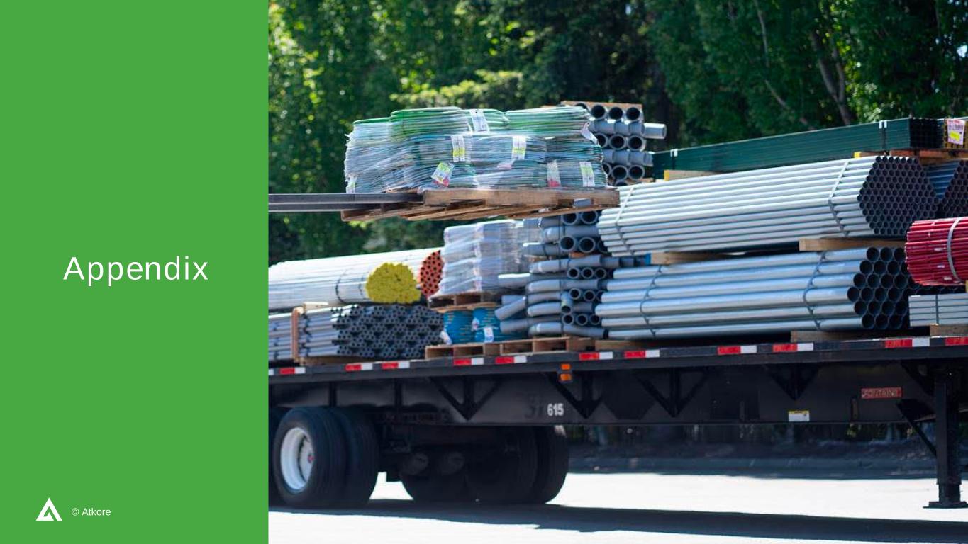 25© Atkore Abbreviations listed in alphanumeric order Glossary of Terms Abbreviation Description 1H First Half 2H Second Half ABS Atkore Business System Adj. Adjusted AI Artificial Intelligence B Billion Capex Capital Expenditures CY Calendar Year DD% Double Digit Percentage EBITDA Earnings Before Interest, Taxes, Depreciation, & Amortization EPD Environmental Product Declaration EPS Earnings Per Share ESG Environmental, Social, and Governance Est. Estimated Excl. Excluding FX or F/X Foreign Exchange FY Fiscal Year HDPE High Density Polyethylene HSD% High Single Digit Percentage IPO Initial Public Offering Abbreviation Description IRA Inflation Reduction Act LDD% Low Double Digit Percentage LSD% Low Single Digit Percentage M Million M&A Mergers & Acquisitions MSD% Mid Single Digit Percentage PVC Polyvinyl Chloride Q1 First Fiscal Quarter Q2 Second Fiscal Quarter Q3 Third Fiscal Quarter Q4 Fourth Fiscal Quarter RSC Regional Service Center S&I Safety & Infrastructure TTM Trailing Twelve Months U.S. United States of America USD United States Dollar #X Number of Times YE Year End YTD Year to Date