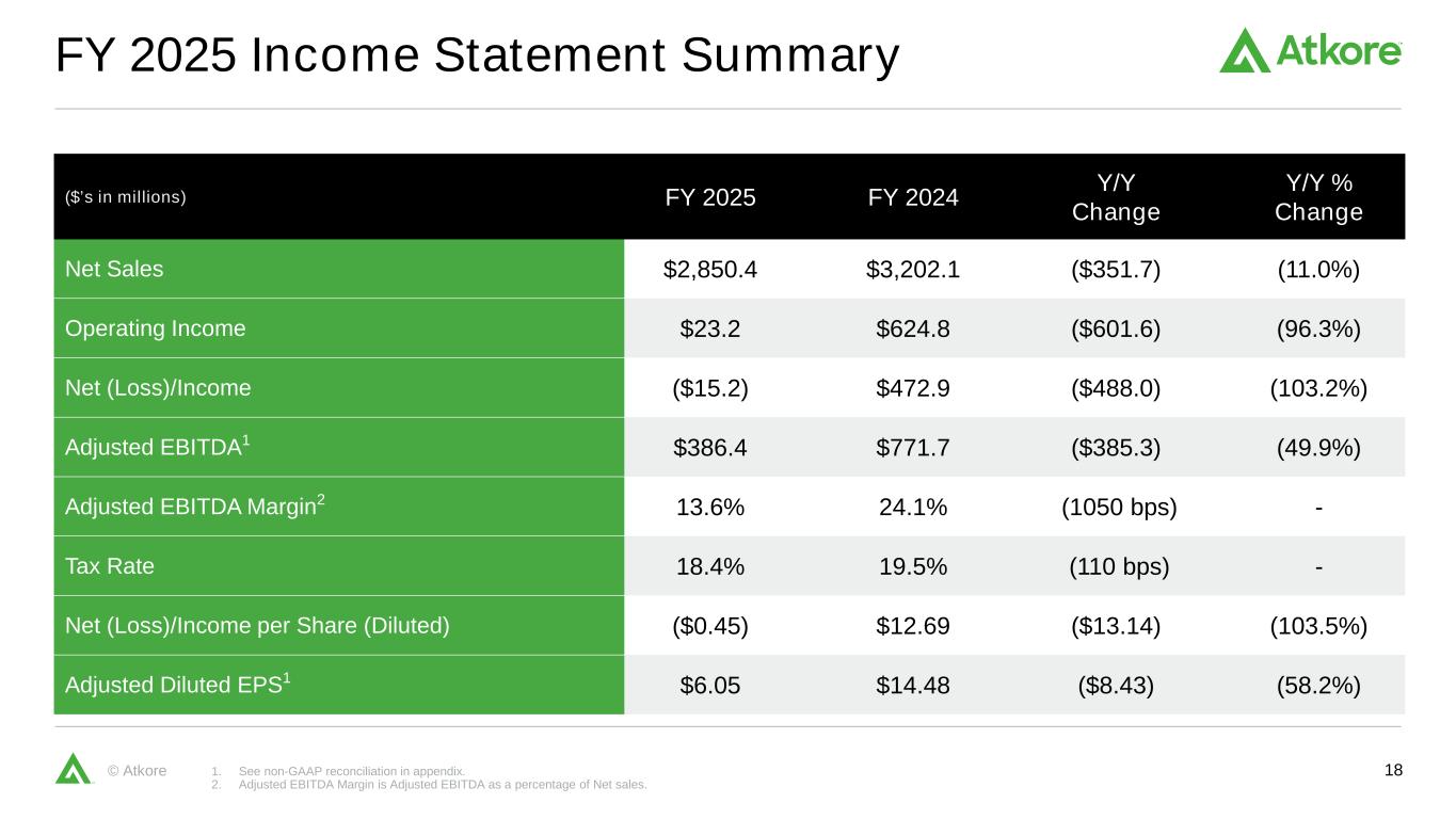 17© Atkore Q4 Income Statement Summary 1. See non-GAAP reconciliation in appendix. 2. Adjusted EBITDA Margin is Adjusted EBITDA as a percentage of Net sales. ($’s in millions) Q4 2025 Q4 2024 Y/Y Change Y/Y % Change Net Sales $752.0 $788.3 ($36.3) (4.6%) Operating Income ($56.8) $102.1 ($158.8) (155.6%) Net (Loss)/Income ($54.4) $73.1 ($127.5) (174.4%) Adjusted EBITDA1 $70.9 $140.2 ($69.2) (49.4%) Adjusted EBITDA Margin2 9.4% 17.8% (840 bps) - Tax Rate 17.3% 20.4% (310 bps) - Net (Loss)/Income per Share (Diluted) ($1.62) $2.02 ($3.64) (180.2%) Adjusted Diluted EPS1 $0.69 $2.43 ($1.74) (71.6%)