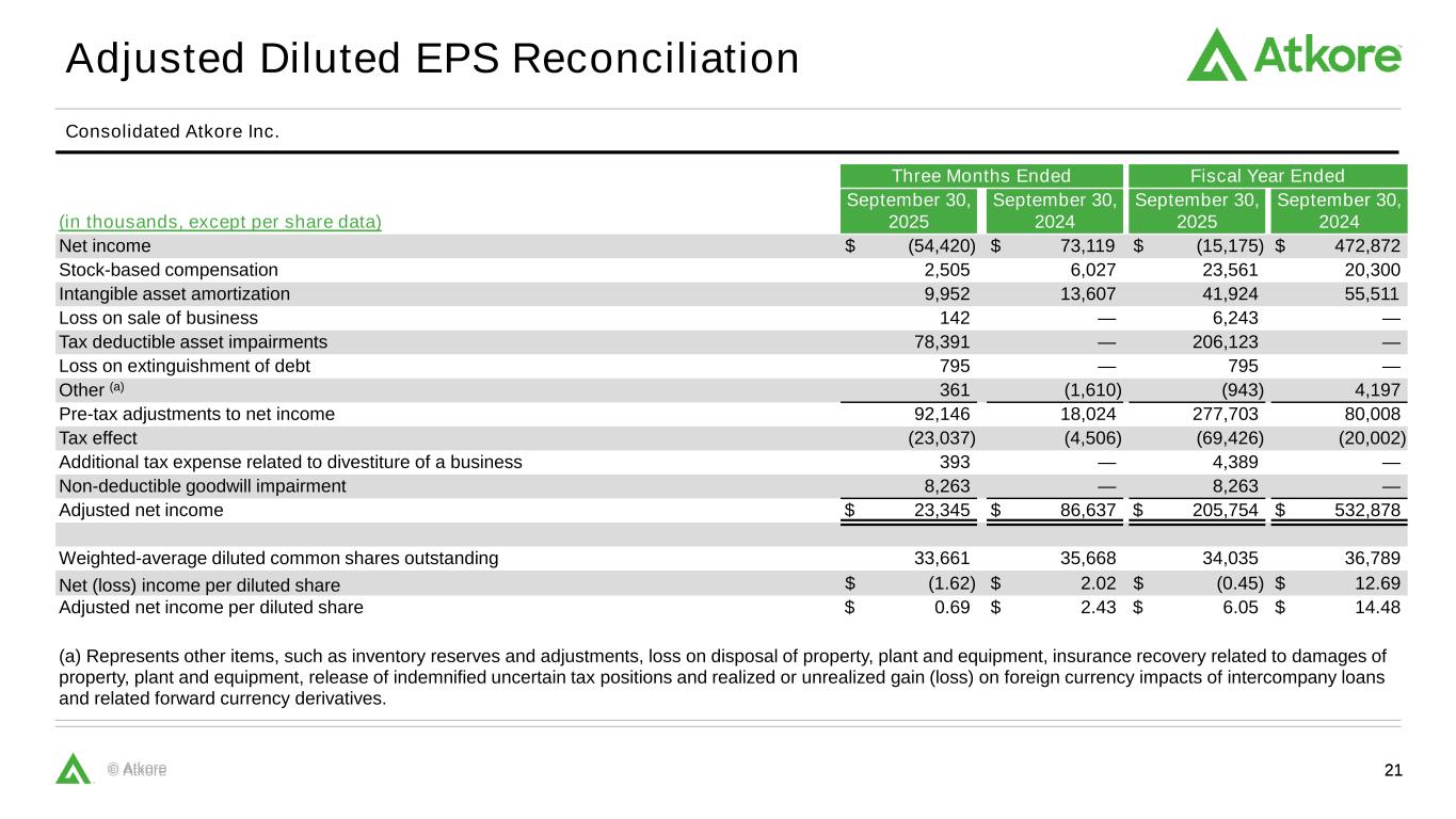 23© Atkore Net Income to Adjusted EBITDA Reconciliation Consolidated Atkore Inc. Fiscal Year Ended (in thousands) September 30, 2025 September 30, 2024 September 30, 2023 September 30, 2022 September 30, 2021 September 30, 2020 Net (loss) income $ (15,175) $ 472,872 $ 689,899 $ 913,434 $ 587,857 $ 152,302 Income tax expense (3,415) 114,365 160,391 290,186 192,144 49,696 Depreciation and amortization 124,533 121,018 115,524 84,415 78,557 74,470 Interest expense, net 33,269 35,584 35,232 30,676 32,899 40,062 Asset Impairment Charges 214,386 — — — — 3,284 Stock-based compensation 23,561 20,300 21,101 17,245 17,047 13,064 Loss on extinguishment of debt 795 — — — 4,202 273 Loss on sale of a business 6,243 — — — — — Loss on assets held for sale 257 733 7,477 — — — Transaction costs 291 140 968 3,424 667 196 Other (a) 1,649 6,701 11,535 2,410 (15,826) (6,712) Adjusted EBITDA $ 386,394 $ 771,713 $ 1,042,127 $ 1,341,790 $ 897,547 $ 326,635 (a) Represents other items, such as inventory reserves and adjustments, loss on disposal of property, plant and equipment, insurance recovery related to damages of property, plant and equipment, release of indemnified uncertain tax positions and realized or unrealized gain (loss) on foreign currency impacts of intercompany loans, restructuring charges, and related forward currency derivatives.