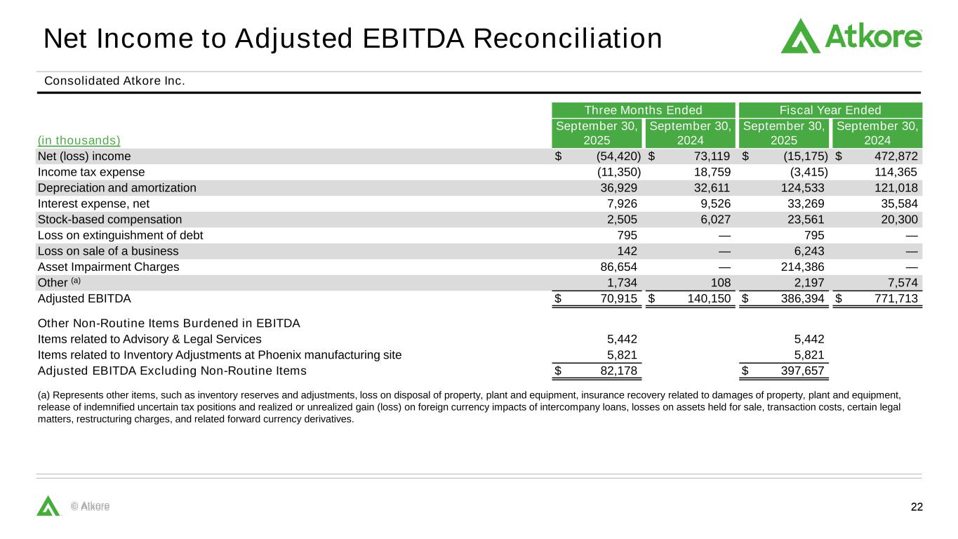 21© Atkore tkore Adjusted Diluted EPS Reconciliation Consolidated Atkore Inc. Three Months Ended Fiscal Year Ended (in thousands, except per share data) September 30, 2025 September 30, 2024 September 30, 2025 September 30, 2024 Net income $ (54,420) $ 73,119 $ (15,175) $ 472,872 Stock-based compensation 2,505 6,027 23,561 20,300 Intangible asset amortization 9,952 13,607 41,924 55,511 Loss on sale of business 142 — 6,243 — Tax deductible asset impairments 78,391 — 206,123 — Loss on extinguishment of debt 795 — 795 — Other (a) 361 (1,610) (943) 4,197 Pre-tax adjustments to net income 92,146 18,024 277,703 80,008 Tax effect (23,037) (4,506) (69,426) (20,002) Additional tax expense related to divestiture of a business 393 — 4,389 — Non-deductible goodwill impairment 8,263 — 8,263 — Adjusted net income $ 23,345 $ 86,637 $ 205,754 $ 532,878 Weighted-average diluted common shares outstanding 33,661 35,668 34,035 36,789 Net (loss) income per diluted share $ (1.62) $ 2.02 $ (0.45) $ 12.69 Adjusted net income per diluted share $ 0.69 $ 2.43 $ 6.05 $ 14.48 (a) Represents other items, such as inventory reserves and adjustments, loss on disposal of property, plant and equipment, insurance recovery related to damages of property, plant and equipment, release of indemnified uncertain tax positions and realized or unrealized gain (loss) on foreign currency impacts of intercompany loans and related forward currency derivatives.