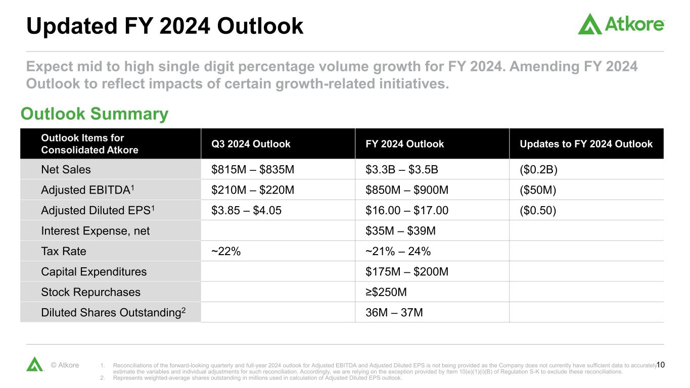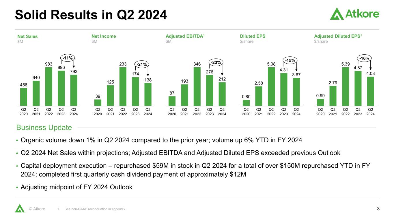 2© Atkore This presentation is provided for general informational purposes only and it does not include every item which may be of interest, nor does it purport to present full and fair disclosure with respect to Atkore Inc. (the “Company” or “Atkore”) or its operational and financial information. Atkore expressly disclaims any current intention to update any forward-looking statements contained in this presentation as a result of new information or future events or developments or otherwise, except as required by federal securities laws. This presentation is not a prospectus and is not an offer to sell securities. This presentation contains forward-looking statements that are subject to known and unknown risks and uncertainties, many of which are beyond our control. All statements other than statements of historical fact included in this presentation are forward-looking statements. Forward-looking statements appearing throughout this presentation include, without limitation, statements regarding our intentions, beliefs, assumptions or current expectations concerning, among other things, financial position; results of operations; cash flows; prospects; growth strategies or expectations; customer retention; the outcome (by judgment or settlement) and costs of legal, administrative or regulatory proceedings, investigations or inspections, including, without limitation, collective, representative or any other litigation; and the impact of prevailing economic conditions. You can identify forward-looking statements by the fact that they do not relate strictly to historical or current facts. These statements may include words such as “believes,” “expects,” “may,” “will,” “shall,” “should,” “would,” “could,” “seeks,” “aims,” “projects,” “is optimistic,” “intends,” “plans,” “estimates,” “anticipates” and other comparable terms. We caution you that forward-looking statements are not guarantees of future performance or outcomes and that actual performance and outcomes, including, without limitation, our actual results of operations, financial condition and liquidity, and the development of the market in which we operate, may differ materially from those made in or suggested by the forward-looking statements contained in this presentation. In addition, even if our results of operations, financial condition and cash flows, and the development of the market in which we operate, are consistent with the forward-looking statements contained in this presentation, those results or developments may not be indicative of results or developments in subsequent periods. A number of important factors, including, without limitation, the risks and uncertainties disclosed in the Company’s filings with the U.S. Securities and Exchange Commission, including but not limited to the Company’s most recent Annual Report on Form 10-K and reports on Form 10-Q and Form 8-K could cause actual results and outcomes to differ materially from those reflected in the forward-looking statements. Because of these risks, we caution that you should not place undue reliance on any of our forward-looking statements. New risks and uncertainties arise from time to time, and it is impossible for us to predict those events or how they may affect us. Further, any forward-looking statement speaks only as of the date on which it is made. We undertake no obligation to revise the forward-looking statements in this presentation after the date of this presentation. Market data and industry information used throughout this presentation are based on management’s knowledge of the industry and the good faith estimates of management. We also relied, to the extent available, upon management’s review of independent industry surveys, forecasts and publications and other publicly available information prepared by a number of third-party sources. All of the market data and industry information used in this presentation involves a number of assumptions and limitations which we believe to be reasonable, but you are cautioned not to give undue weight to such estimates. Although we believe that these sources are reliable, we cannot guarantee the accuracy or completeness of this information, and we have not independently verified this information. While we believe the estimated market position, market opportunity and market size information included in this presentation are generally reliable, such information, which is derived in part from management’s estimates and beliefs, is inherently uncertain and imprecise. Projections, assumptions and estimates of our future performance and the future performance of the industry in which we operate are subject to a high degree of uncertainty and risk due to a variety of factors, including those described above. These and other factors could cause results to differ materially from those expressed in our estimates and beliefs and in the estimates prepared by independent parties. This presentation should be read along with the historical financial statements of Atkore, including the most recent audited financial statements. Historical results may not be indicative of future results. We use non-GAAP financial measures to help us describe our operating and financial performance. These measures may include Adjusted EBITDA, Adjusted EBITDA margin (Adjusted EBITDA over Net sales), Net debt (total debt less cash and cash equivalents), Adjusted Net Income Per Diluted Share (also referred to as “Adjusted Diluted EPS”), Leverage ratio (net debt or total debt less cash and cash equivalents, over Adjusted EBITDA on trailing twelve month (“TTM”) basis), Free Cash Flow (net cash provided by operating activities less capital expenditures) and Return on Capital to help us describe our operating and financial performance. These non-GAAP financial measures are commonly used in our industry and have certain limitations and should not be construed as alt