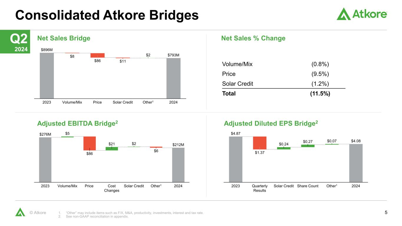 4© Atkore Q2 Income Statement Summary 1. See non-GAAP reconciliation in appendix. 2. Adjusted EBITDA Margin is Adjusted EBITDA as a percentage of Net Sales. ($’s in millions) Q2 2024 Q2 2023 Y/Y Change Y/Y % Change Net Sales $792.9 $895.9 ($103.0) (11.5%) Operating Income $178.8 $239.9 ($61.1) (25.5%) Net Income $138.0 $174.2 ($36.2) (20.8%) Adjusted EBITDA1 $211.9 $276.0 ($64.1) (23.2%) Adjusted EBITDA Margin2 26.7% 30.8% (410 bps) - Tax Rate 18.7% 23.5% (480 bps) - Net Income Per Share (Diluted) $3.67 $4.31 ($0.64) (14.8%) Adjusted Diluted EPS1 $4.08 $4.87 ($0.79) (16.2%)