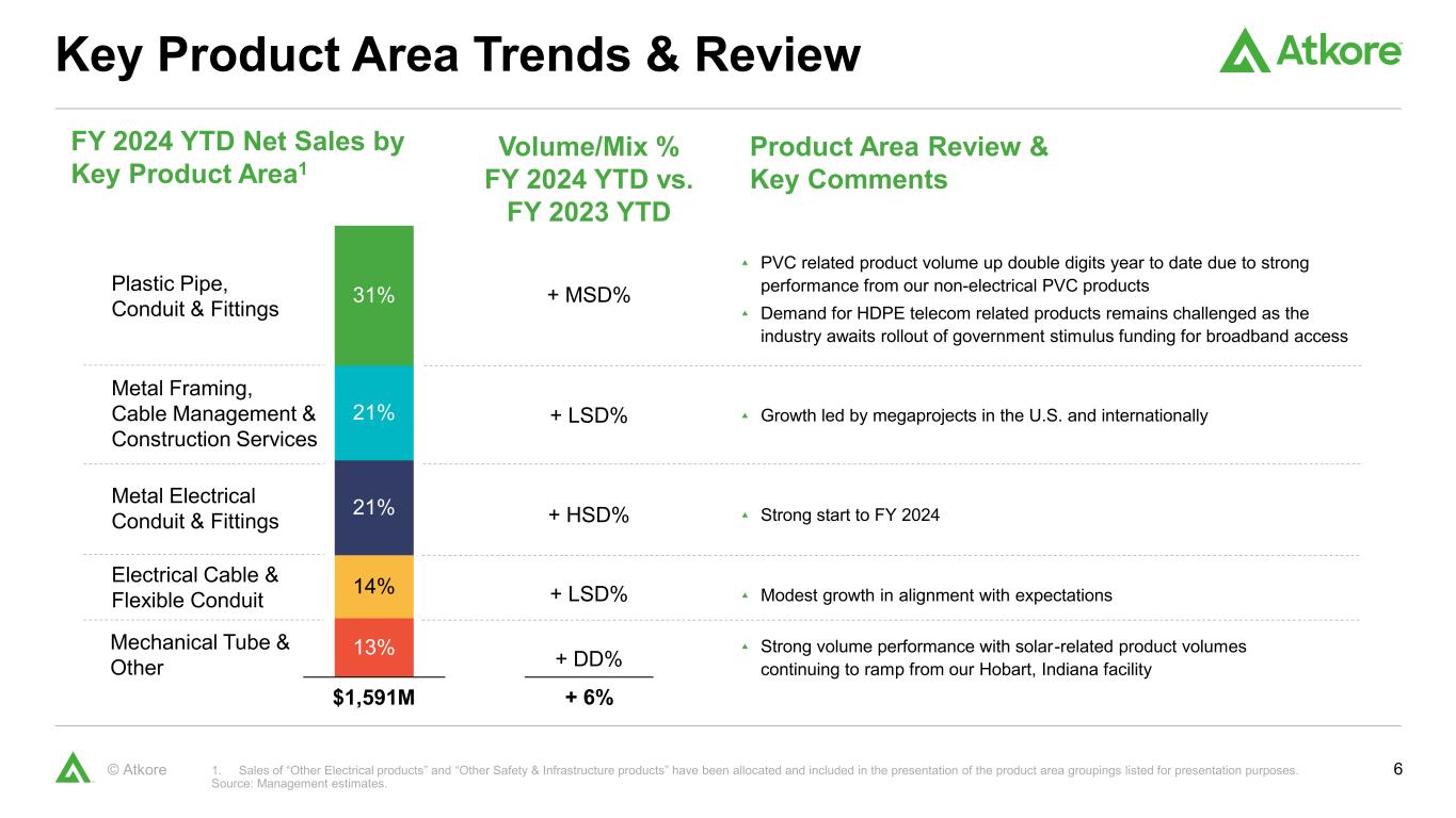 5© Atkore Consolidated Atkore Bridges 1. “Other” may include items such as F/X, M&A, productivity, investments, interest and tax rate. 2. See non-GAAP reconciliation in appendix. Adjusted EBITDA Bridge2 Net Sales BridgeQ2 2024 $8 $86 $11 $2 2023 Volume/Mix Price Solar Credit Other1 2024 $896M $793M $5 $86 $21 $2 $6 2023 Volume/Mix Price Cost Changes Solar Credit Other1 2024 $276M $212M Net Sales % Change Adjusted Diluted EPS Bridge2 Volume/Mix (0.8%) Price (9.5%) Solar Credit (1.2%) Total (11.5%) $4.87 $4.08 $1.37 $0.24 $0.27 $0.07 2023 Quarterly Results Solar Credit Share Count Other1 2024