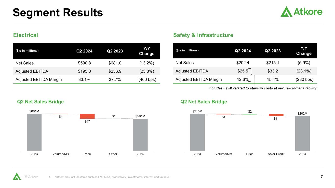 13© Atkore Segment Information Three months ended March 29, 2024 March 31, 2023 (in thousands) Net sales Adjusted EBITDA Adjusted EBITDA Margin Net sales Adjusted EBITDA Adjusted EBITDA Margin Electrical $ 590,820 $ 195,752 33.1 % $ 680,965 $ 256,883 37.7 % Safety & Infrastructure 202,419 25,529 12.6 % 215,054 33,194 15.4 % Eliminations (328) (85) Consolidated operations $ 792,911 $ 895,934