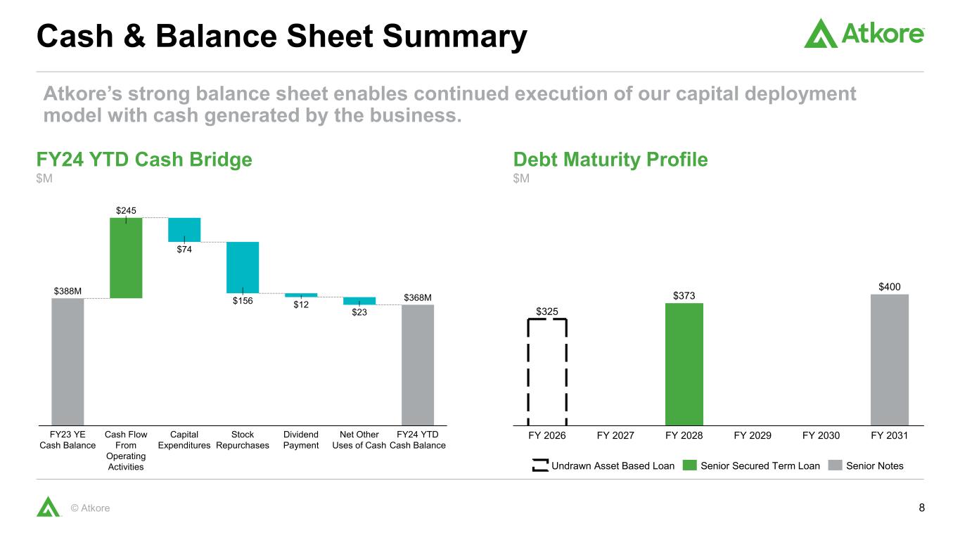 7© Atkore Segment Results $4 $87 2023 Volume/Mix Price Other1 2024 $681M $591M$1 Q2 Net Sales Bridge $4 $2 $11 2023 Volume/Mix Price Solar Credit 2024 $215M $202M Q2 Net Sales Bridge Electrical Safety & Infrastructure ($’s in millions) Q2 2024 Q2 2023 Y/Y Change Net Sales $590.8 $681.0 (13.2%) Adjusted EBITDA $195.8 $256.9 (23.8%) Adjusted EBITDA Margin 33.1% 37.7% (460 bps) ($’s in millions) Q2 2024 Q2 2023 Y/Y Change Net Sales $202.4 $215.1 (5.9%) Adjusted EBITDA $25.5 $33.2 (23.1%) Adjusted EBITDA Margin 12.6% 15.4% (280 bps) 1. “Other” may include items such as F/X, M&A, productivity, investments, interest and tax rate. Includes ~$3M related to start-up costs at our new Indiana facility