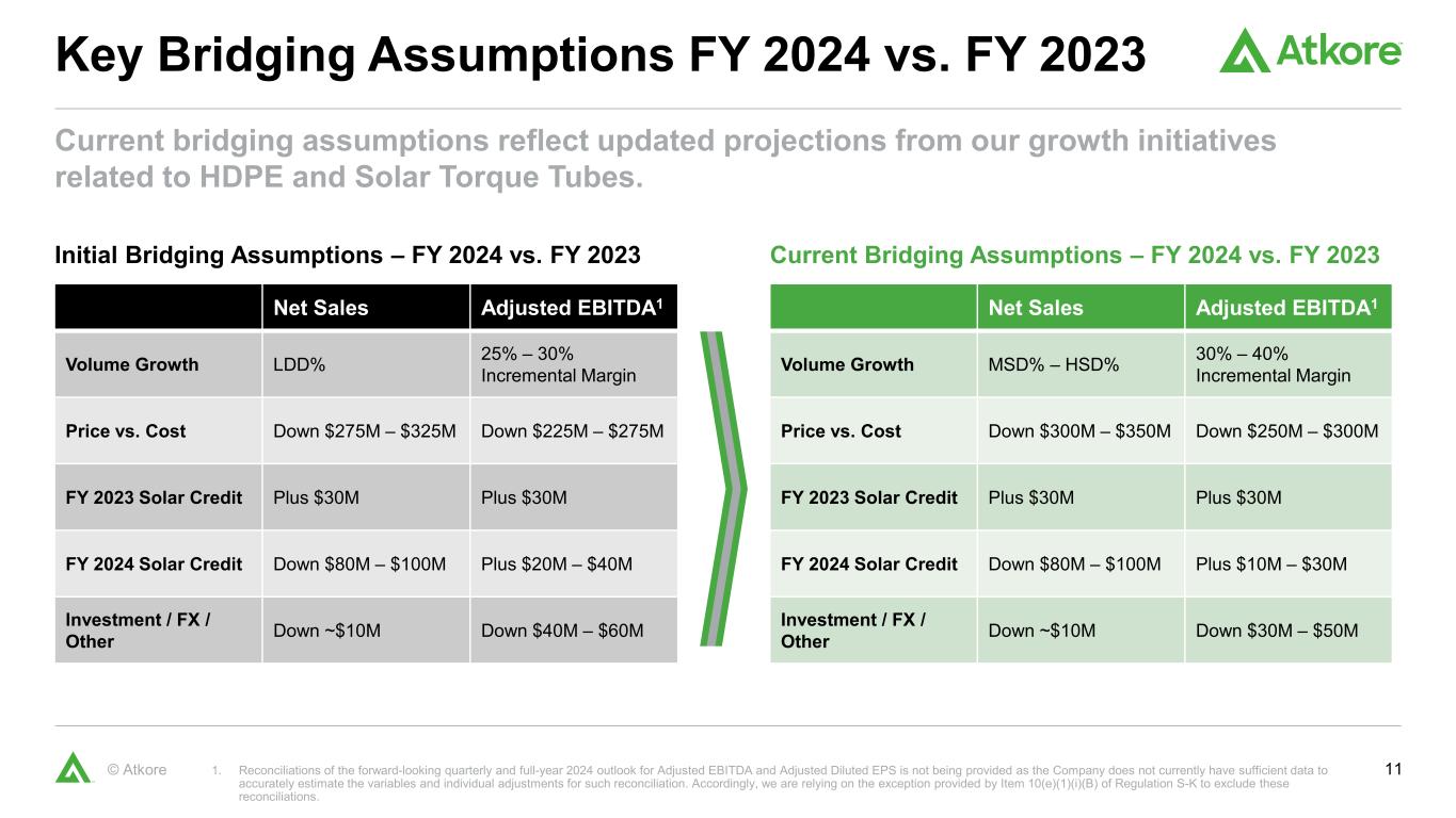 10© Atkore Updated FY 2024 Outlook Outlook Summary 1. Reconciliations of the forward-looking quarterly and full-year 2024 outlook for Adjusted EBITDA and Adjusted Diluted EPS is not being provided as the Company does not currently have sufficient data to accurately estimate the variables and individual adjustments for such reconciliation. Accordingly, we are relying on the exception provided by Item 10(e)(1)(i)(B) of Regulation S-K to exclude these reconciliations. 2. Represents weighted-average shares outstanding in millions used in calculation of Adjusted Diluted EPS outlook. Outlook Items for Consolidated Atkore Q3 2024 Outlook FY 2024 Outlook Updates to FY 2024 Outlook Net Sales $815M – $835M $3.3B – $3.5B ($0.2B) Adjusted EBITDA1 $210M – $220M $850M – $900M ($50M) Adjusted Diluted EPS1 $3.85 – $4.05 $16.00 – $17.00 ($0.50) Interest Expense, net $35M – $39M Tax Rate ~22% ~21% – 24% Capital Expenditures $175M – $200M Stock Repurchases ≥$250M Diluted Shares Outstanding2 36M – 37M Expect mid to high single digit percentage volume growth for FY 2024. Amending FY 2024 Outlook to reflect impacts of certain growth-related initiatives.