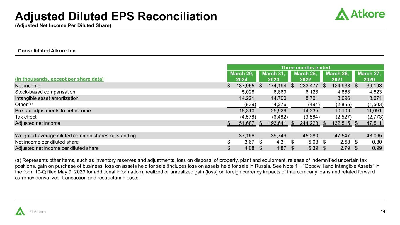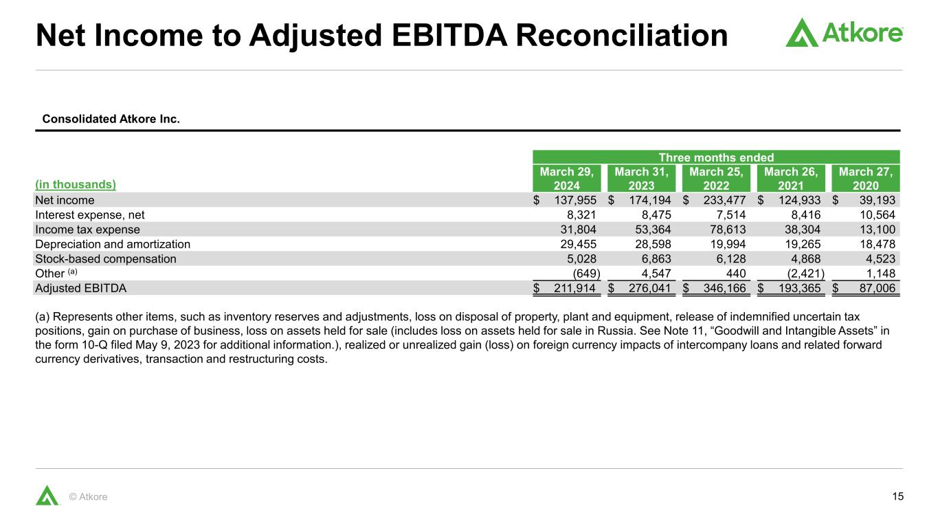 14© Atkore Consolidated Atkore Inc. Adjusted Diluted EPS Reconciliation (Adjusted Net Income Per Diluted Share) Three months ended (in thousands, except per share data) March 29, 2024 March 31, 2023 March 25, 2022 March 26, 2021 March 27, 2020 Net income $ 137,955 $ 174,194 $ 233,477 $ 124,933 $ 39,193 Stock-based compensation 5,028 6,863 6,128 4,868 4,523 Intangible asset amortization 14,221 14,790 8,701 8,096 8,071 Other (a) (939) 4,276 (494) (2,855) (1,503) Pre-tax adjustments to net income 18,310 25,929 14,335 10,109 11,091 Tax effect (4,578) (6,482) (3,584) (2,527) (2,773) Adjusted net income $ 151,687 $ 193,641 $ 244,228 $ 132,515 $ 47,511 Weighted-average diluted common shares outstanding 37,166 39,749 45,280 47,547 48,095 Net income per diluted share $ 3.67 $ 4.31 $ 5.08 $ 2.58 $ 0.80 Adjusted net income per diluted share $ 4.08 $ 4.87 $ 5.39 $ 2.79 $ 0.99 (a) Represents other items, such as inventory reserves and adjustments, loss on disposal of property, plant and equipment, release of indemnified uncertain tax positions, gain on purchase of business, loss on assets held for sale (includes loss on assets held for sale in Russia. See Note 11, “Goodwill and Intangible Assets” in the form 10-Q filed May 9, 2023 for additional information), realized or unrealized gain (loss) on foreign currency impacts of intercompany loans and related forward currency derivatives, transaction and restructuring costs.