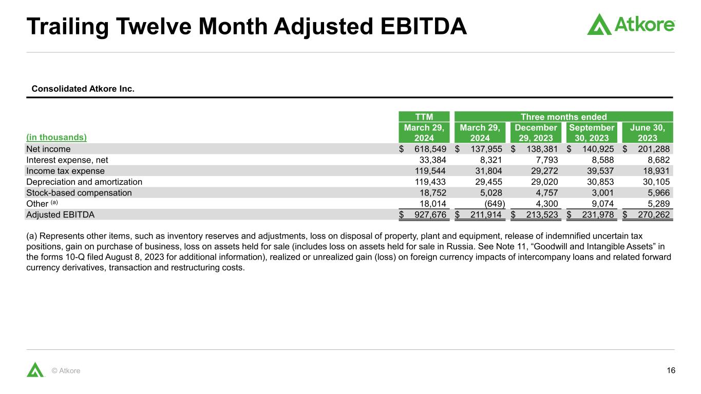 15© Atkore Net Income to Adjusted EBITDA Reconciliation Consolidated Atkore Inc. Three months ended (in thousands) March 29, 2024 March 31, 2023 March 25, 2022 March 26, 2021 March 27, 2020 Net income $ 137,955 $ 174,194 $ 233,477 $ 124,933 $ 39,193 Interest expense, net 8,321 8,475 7,514 8,416 10,564 Income tax expense 31,804 53,364 78,613 38,304 13,100 Depreciation and amortization 29,455 28,598 19,994 19,265 18,478 Stock-based compensation 5,028 6,863 6,128 4,868 4,523 Other (a) (649) 4,547 440 (2,421) 1,148 Adjusted EBITDA $ 211,914 $ 276,041 $ 346,166 $ 193,365 $ 87,006 (a) Represents other items, such as inventory reserves and adjustments, loss on disposal of property, plant and equipment, release of indemnified uncertain tax positions, gain on purchase of business, loss on assets held for sale (includes loss on assets held for sale in Russia. See Note 11, “Goodwill and Intangible Assets” in the form 10-Q filed May 9, 2023 for additional information.), realized or unrealized gain (loss) on foreign currency impacts of intercompany loans and related forward currency derivatives, transaction and restructuring costs.