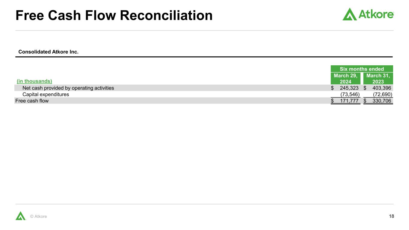 17© Atkore Total Debt to Net Debt Consolidated Atkore Inc. (in thousands) March 29, 2024 December 29, 2023 September 30, 2023 June 30, 2023 March 31, 2023 December 30, 2022 Long-term debt $ 763,762 $ 763,225 $ 762,687 $ 762,149 $ 761,612 $ 761,074 Total debt 763,762 763,225 762,687 762,149 761,612 761,074 Less cash and cash equivalents 368,050 380,922 $ 388,114 317,809 354,342 307,827 Net debt $ 395,712 $ 382,303 $ 374,573 $ 444,340 $ 407,270 $ 453,247