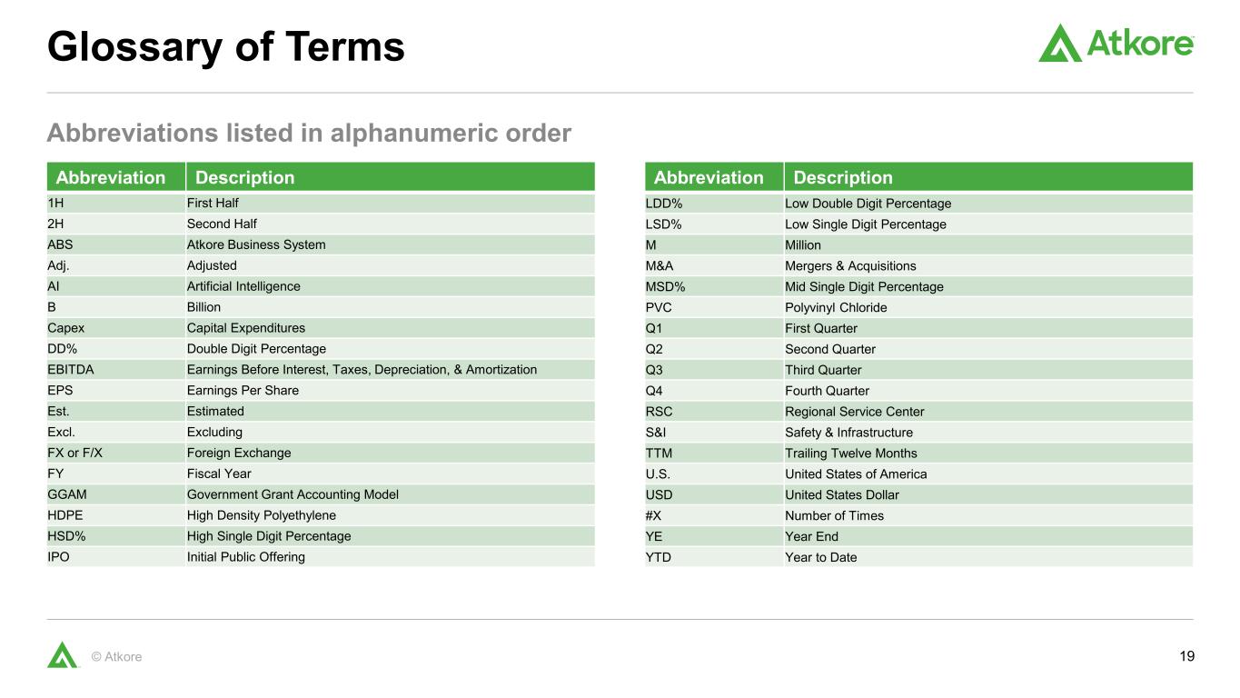 19© Atkore Abbreviations listed in alphanumeric order Glossary of Terms Abbreviation Description 1H First Half 2H Second Half ABS Atkore Business System Adj. Adjusted AI Artificial Intelligence B Billion Capex Capital Expenditures DD% Double Digit Percentage EBITDA Earnings Before Interest, Taxes, Depreciation, & Amortization EPS Earnings Per Share Est. Estimated Excl. Excluding FX or F/X Foreign Exchange FY Fiscal Year GGAM Government Grant Accounting Model HDPE High Density Polyethylene HSD% High Single Digit Percentage IPO Initial Public Offering Abbreviation Description LDD% Low Double Digit Percentage LSD% Low Single Digit Percentage M Million M&A Mergers & Acquisitions MSD% Mid Single Digit Percentage PVC Polyvinyl Chloride Q1 First Quarter Q2 Second Quarter Q3 Third Quarter Q4 Fourth Quarter RSC Regional Service Center S&I Safety & Infrastructure TTM Trailing Twelve Months U.S. United States of America USD United States Dollar #X Number of Times YE Year End YTD Year to Date