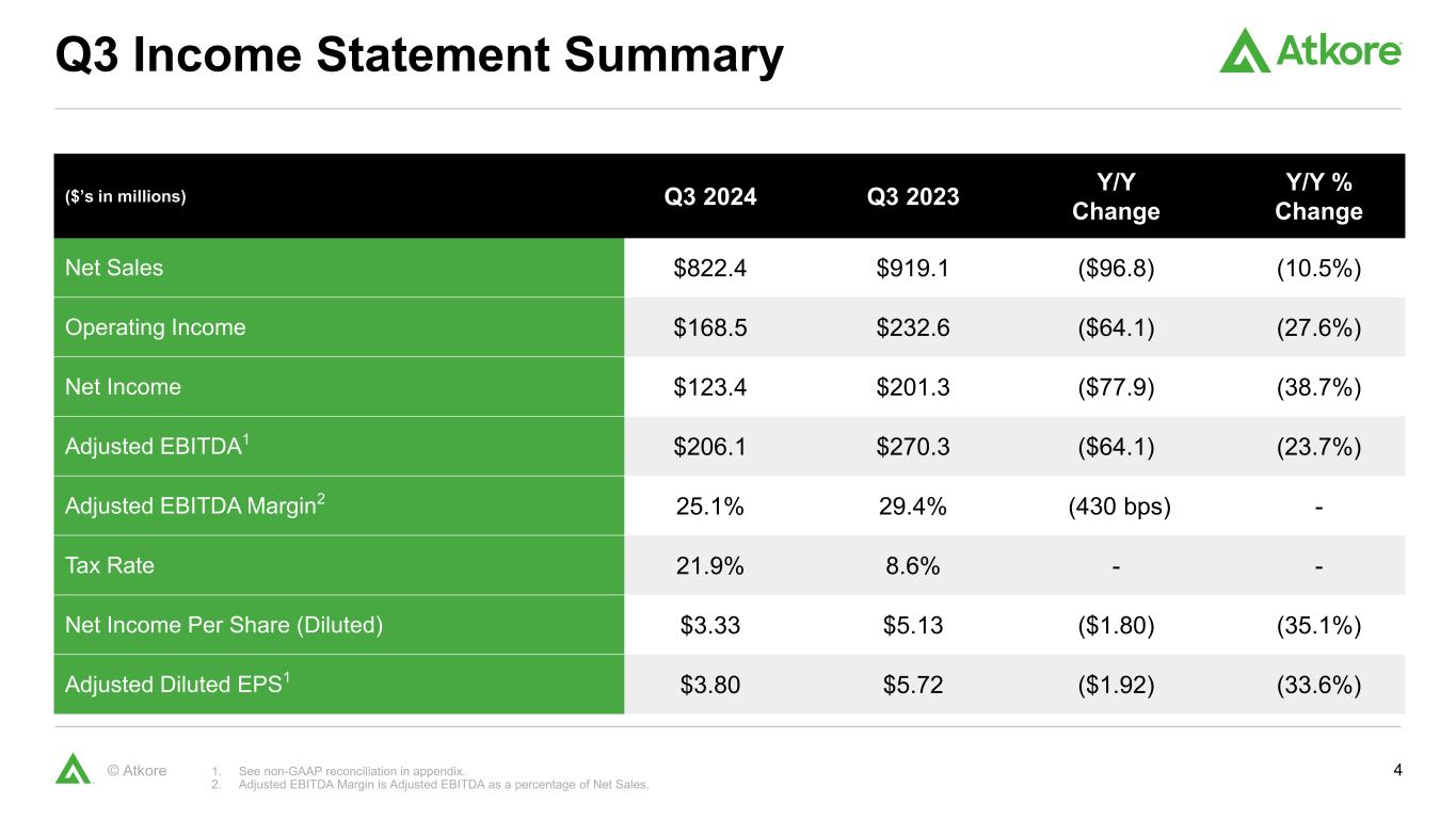 3© Atkore Q3 2024 Results 1. See non-GAAP reconciliation in appendix. Net Sales $M Net Income $M Adjusted EBITDA1 $M Adjusted Diluted EPS1 $/share Diluted EPS $/share Organic volume flat in Q3 2024 compared to the prior year; volume up 8% sequentially and 4% YTD in FY 2024 Adjusted EBITDA and Adjusted Diluted EPS off 4% from the midpoint due to overall softer pricing environment Sequential production and shipment improvements at Hobart solar torque tube plant; HDPE market challenges continue Repurchased $125M in stock in Q3 2024 for a total of more than $280M in stock repurchased YTD Updating FY 2024 Outlook to reflect ongoing macroeconomic challenges Business Update 384.9 853.7 1,061.6 919.1 822.4 Q3 2020 Q3 2021 Q3 2022 Q3 2023 Q3 2024 -11% 63.7 274.3 377.5 270.3 206.1 Q3 2020 Q3 2021 Q3 2022 Q3 2023 Q3 2024 -24% 0.67 3.96 6.07 5.72 3.80 Q3 2020 Q3 2021 Q3 2022 Q3 2023 Q3 2024 -34% 0.49 3.64 5.74 5.13 3.33 Q3 2020 Q3 2021 Q3 2022 Q3 2023 Q3 2024 -35% 24.1 175.3 254.3 201.3 123.4 Q3 2020 Q3 2021 Q3 2022 Q3 2023 Q3 2024 -39%