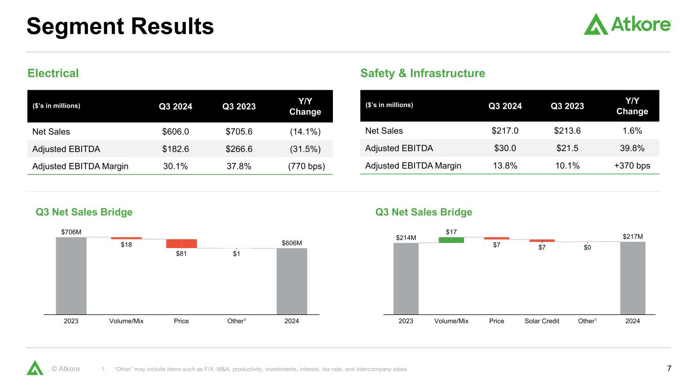 12© Atkore Segment Information Three months ended June 28, 2024 June 30, 2023 (in thousands) Net sales Adjusted EBITDA Adjusted EBITDA Margin Net sales Adjusted EBITDA Adjusted EBITDA Margin Electrical $ 605,962 $ 182,568 30.1 % $ 705,617 $ 266,556 37.8 % Safety & Infrastructure 217,024 30,042 13.8 % 213,606 21,493 10.1 % Eliminations (622) (106) Consolidated operations $ 822,364 $ 919,117