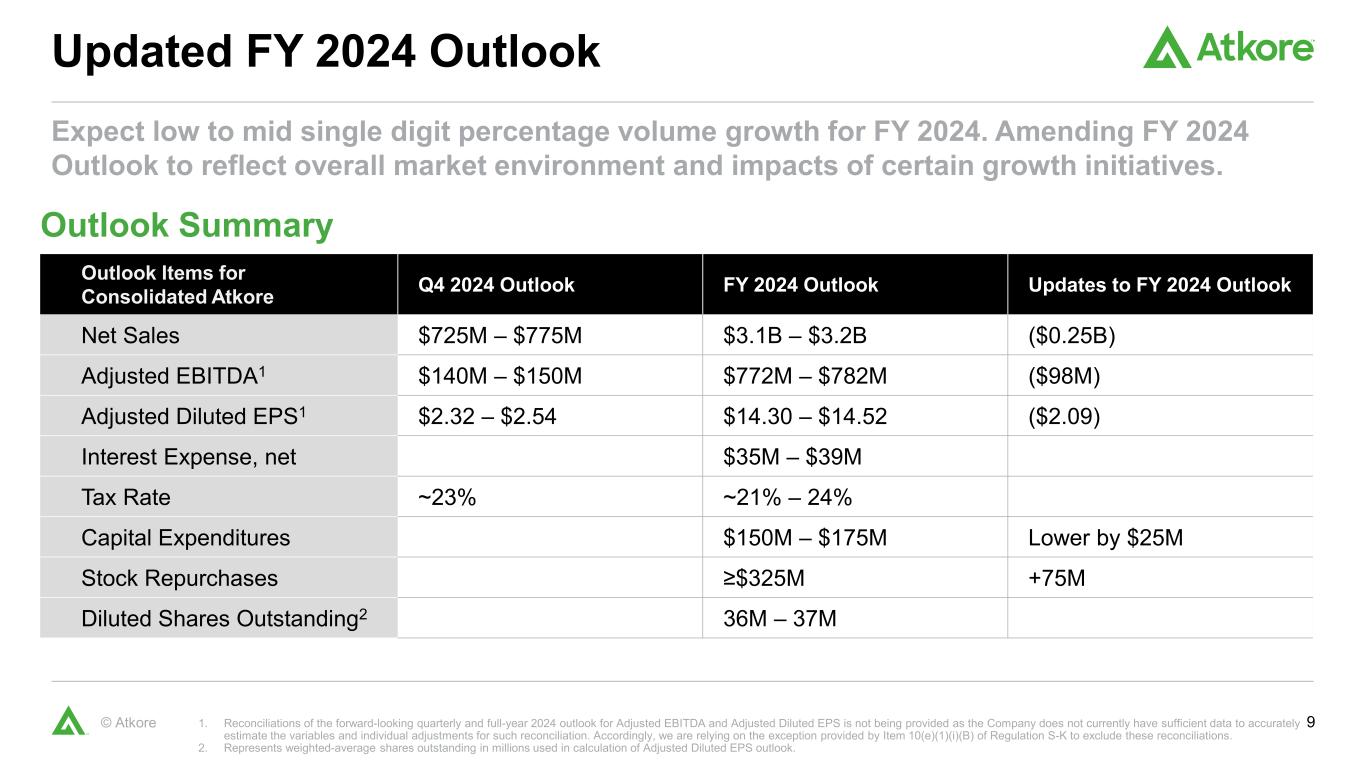 9© Atkore Updated FY 2024 Outlook Outlook Summary 1. Reconciliations of the forward-looking quarterly and full-year 2024 outlook for Adjusted EBITDA and Adjusted Diluted EPS is not being provided as the Company does not currently have sufficient data to accurately estimate the variables and individual adjustments for such reconciliation. Accordingly, we are relying on the exception provided by Item 10(e)(1)(i)(B) of Regulation S-K to exclude these reconciliations. 2. Represents weighted-average shares outstanding in millions used in calculation of Adjusted Diluted EPS outlook. Outlook Items for Consolidated Atkore Q4 2024 Outlook FY 2024 Outlook Updates to FY 2024 Outlook Net Sales $725M – $775M $3.1B – $3.2B ($0.25B) Adjusted EBITDA1 $140M – $150M $772M – $782M ($98M) Adjusted Diluted EPS1 $2.32 – $2.54 $14.30 – $14.52 ($2.09) Interest Expense, net $35M – $39M Tax Rate ~23% ~21% – 24% Capital Expenditures $150M – $175M Lower by $25M Stock Repurchases ≥$325M +75M Diluted Shares Outstanding2 36M – 37M Expect low to mid single digit percentage volume growth for FY 2024. Amending FY 2024 Outlook to reflect overall market environment and impacts of certain growth initiatives.