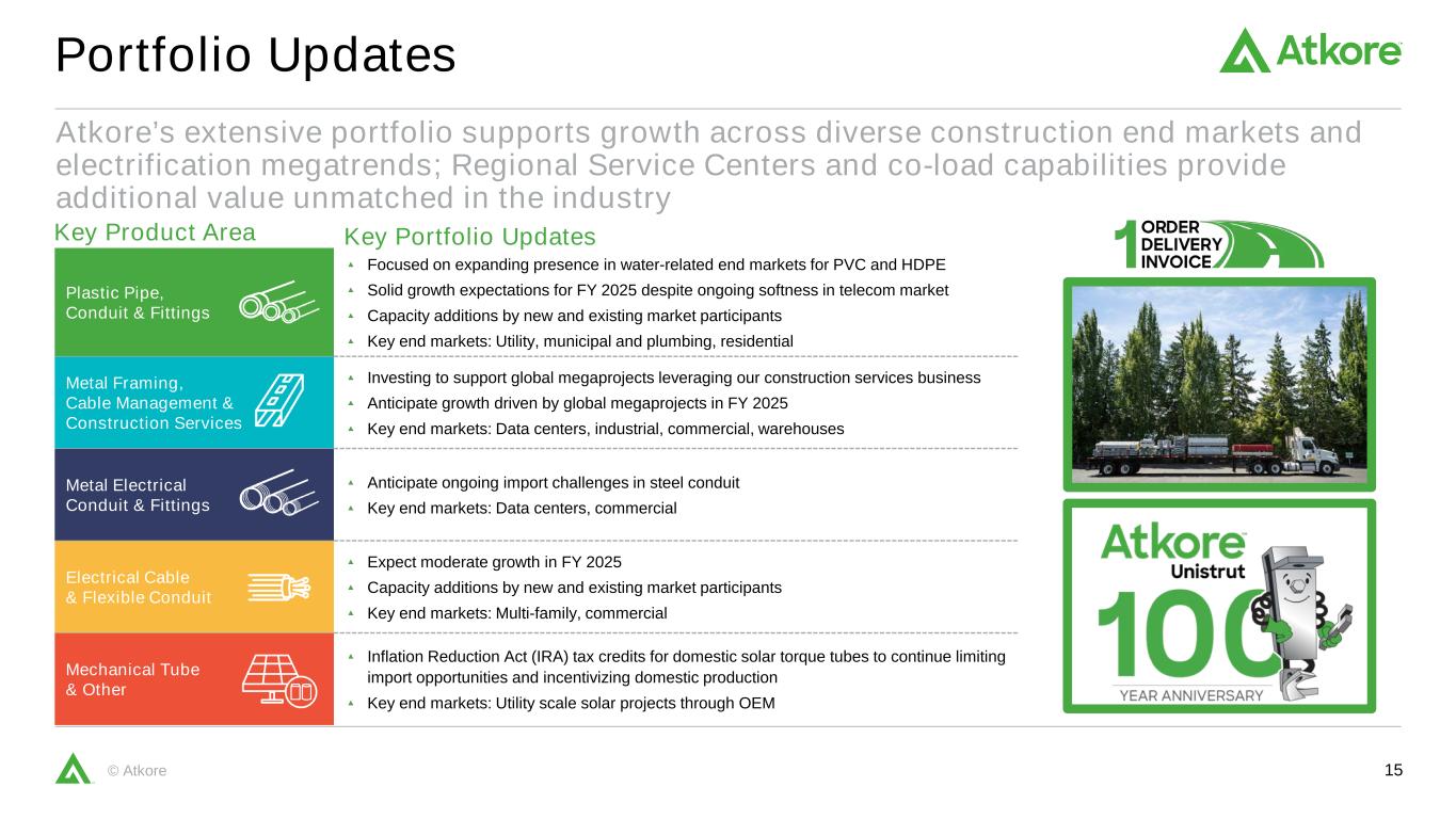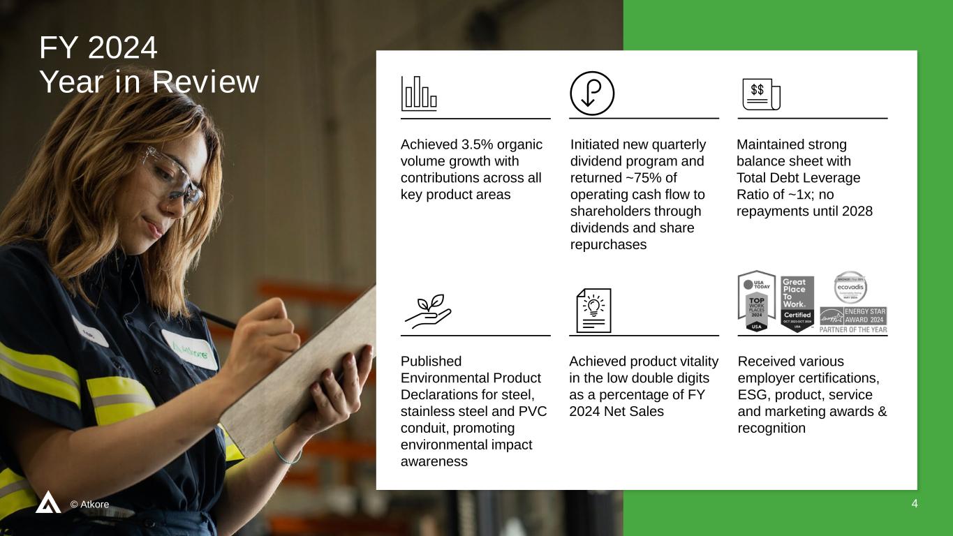 3© Atkore Today’s Discussion 1. FY 2024 Results & FY 2025 Outlook 2. Business Update 3. Capital Deployment Update & Long-term Trends
