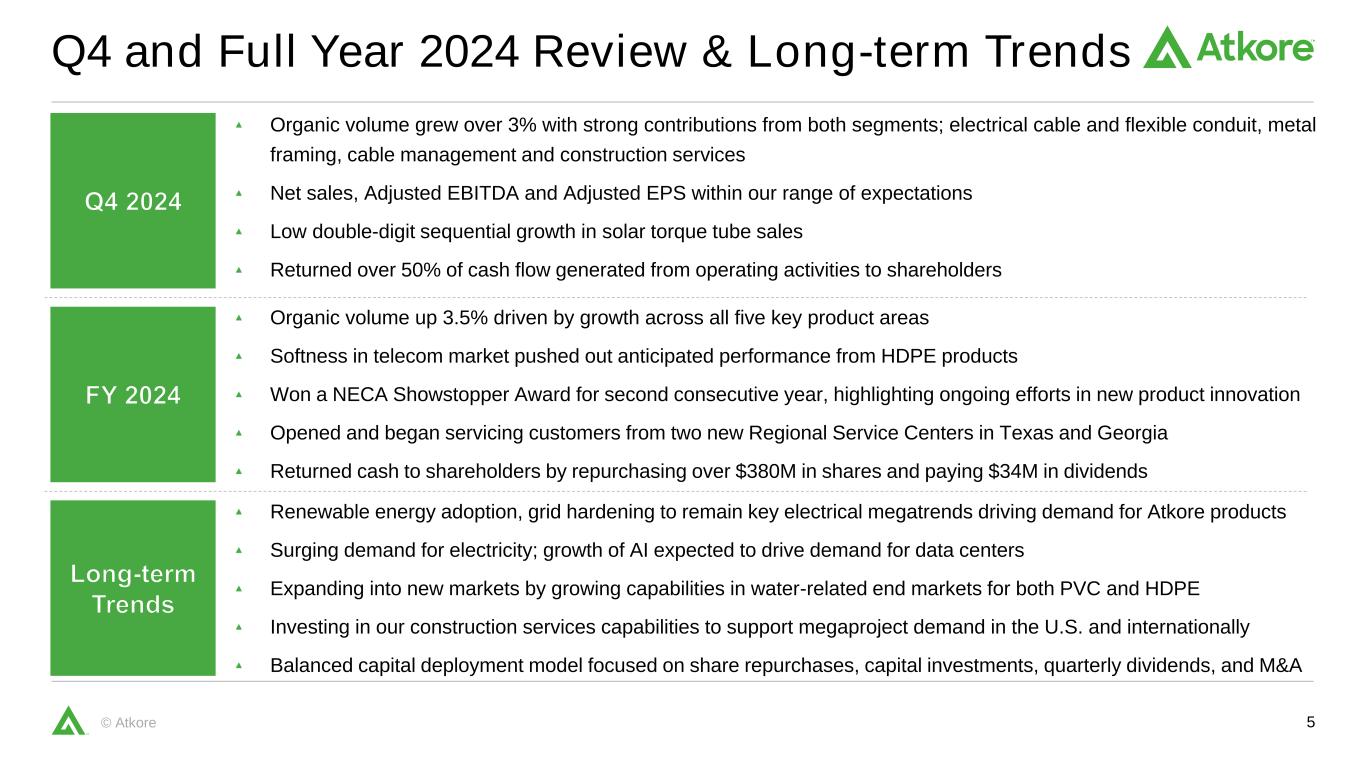 4© Atkore FY 2024 Year in Review Achieved 3.5% organic volume growth with contributions across all key product areas Achieved product vitality in the low double digits as a percentage of FY 2024 Net Sales Published Environmental Product Declarations for steel, stainless steel and PVC conduit, promoting environmental impact awareness Received various employer certifications, ESG, product, service and marketing awards & recognition Maintained strong balance sheet with Total Debt Leverage Ratio of ~1x; no repayments until 2028 Initiated new quarterly dividend program and returned ~75% of operating cash flow to shareholders through dividends and share repurchases