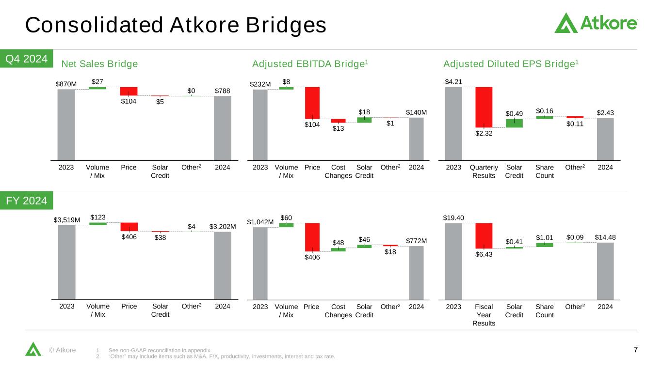 6© Atkore Q4 and Full Year 2024 1. See non-GAAP reconciliation in appendix. 870 788 Q4 2023 Q4 2024 -9% 141 73 Q4 2023 Q4 2024 -48% 232 140 Q4 2023 Q4 2024 -40% 4.21 2.43 Q4 2023 Q4 2024 -42% Net Sales $M Net Income $M Adjusted EBITDA1 $M Adjusted Diluted EPS1 $/share 3,519 3,202 FY 2023 FY 2024 -9% 690 473 FY 2023 FY 2024 -32% 1,042 772 FY 2023 FY 2024 -26% 19.40 14.48 FY 2023 FY 2024 -25% 3.63 2.02 Q4 2023 Q4 2024 -44% Diluted EPS $/share 17.27 12.69 FY 2023 FY 2024 -27% Q4 2023Q4 2024 FY 2024