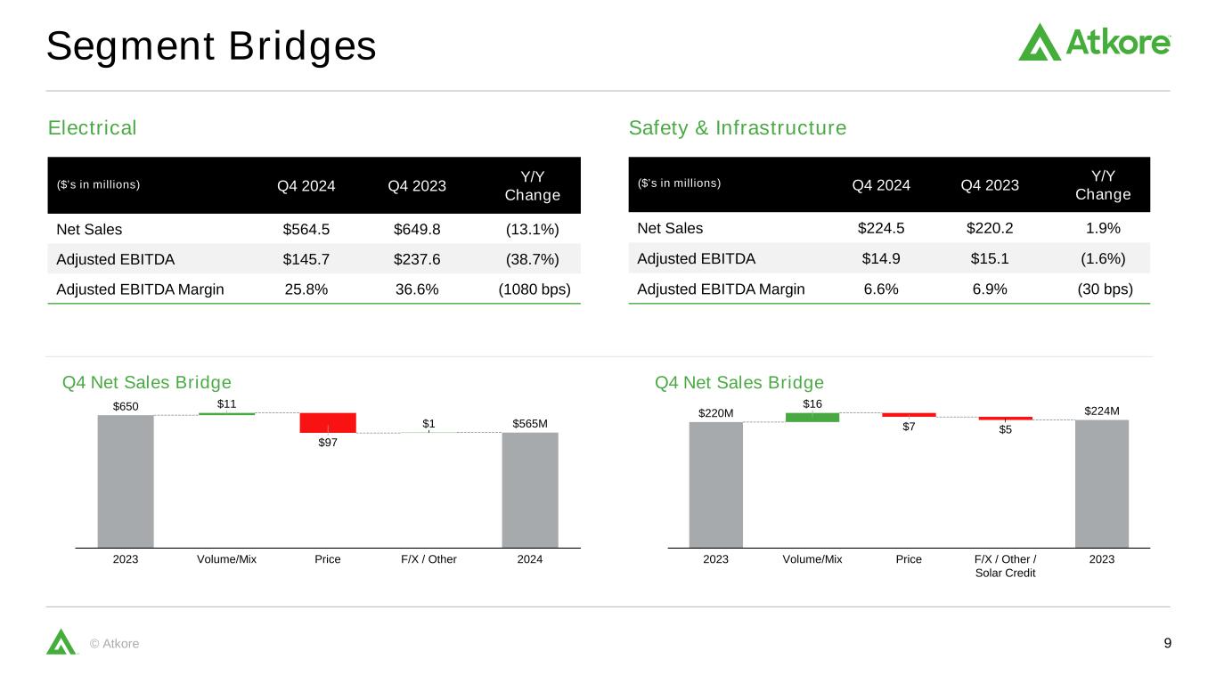 8© Atkore FY 2024 Net Sales by Key Product Area1 Key Product Area Trends & Review 30% 23% 20% 15% 12% $3.2B Plastic Pipe, Conduit & Fittings Metal Framing, Cable Management & Construction Services Metal Electrical Conduit & Fittings Electrical Cable & Flexible Conduit 1. Sales of “Other Electrical products” and “Other Safety & Infrastructure products” have been allocated and included in the presentation of the product area groupings listed for presentation purposes. Source: Management estimates. FY 2024 vs. FY 2023 + LSD% + MSD% + LSD% + MSD% + DD% + 3.5% Mechanical Tube & Other Growth in PVC related products driven by double-digit growth in PVC water products in FY 2024 and expected growth for electrical conduit Demand for HDPE telecom related products remained challenged in FY 2024, down over 20% as the industry awaits rollout of government stimulus funding for broadband access FY 2024 volume growth within original expectations despite increased pressure from import competition Growth led by megaprojects in the U.S. and internationally Megaprojects also contributing to growth in metal framing Return of volume growth in FY 2024 Patented and differentiated products recognized as best in class Growth due to onshoring of solar torque tubes Leveraging new facility in Hobart, IN FY 2023 vs. FY 2022 - MSD% + DD% + HSD% - LSD% + DD% + 3.2% Product Area Trends & Key CommentsYear-over-Year Volume/Mix % Change
