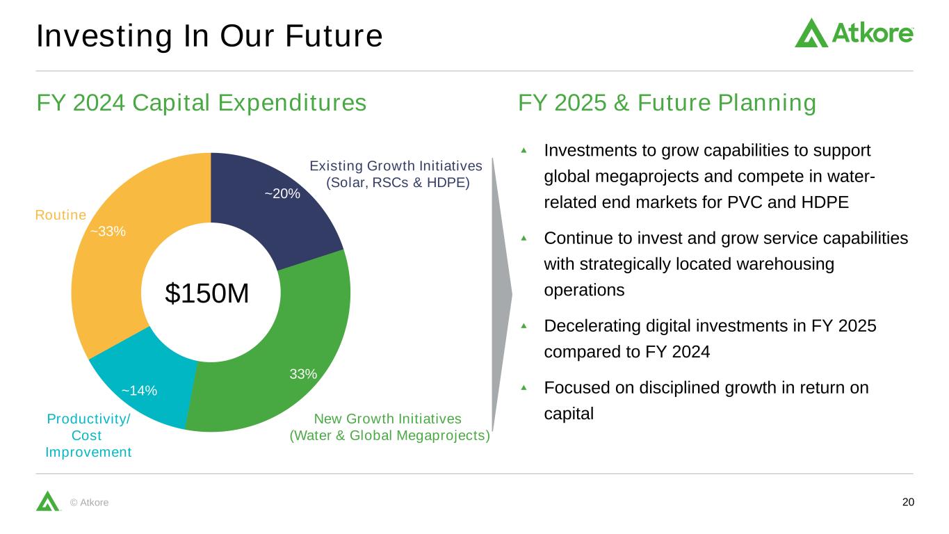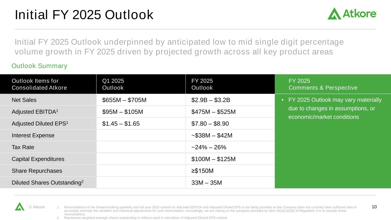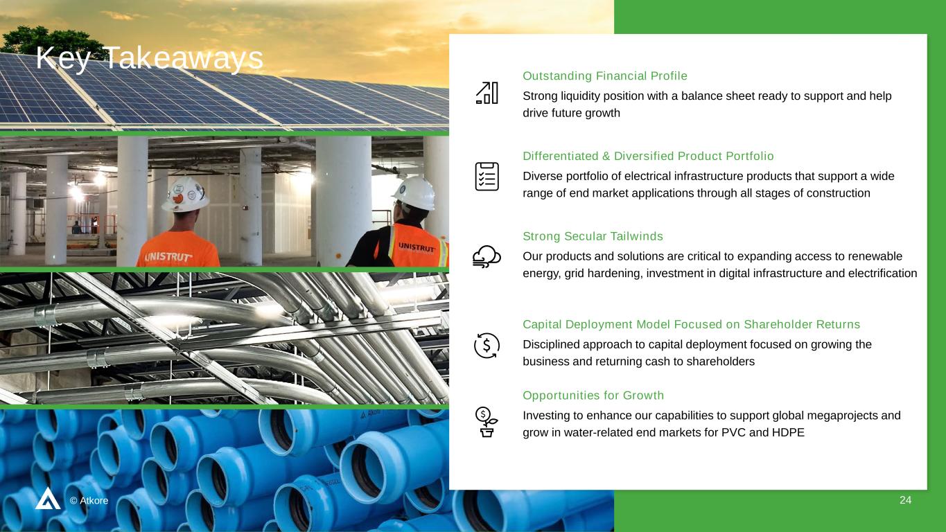 23© Atkore Potential Upside Factors • Government intervention to minimize levels of steel conduit imports • Lower interest and mortgage rates benefiting certain markets • Increase or acceleration of funding from government stimulus programs • Stronger than anticipated telecom industry recovery • Acceleration of global megaproject activity • Manufacturing efficiency gains to support stronger end markets Potential Downside Factors • Further growth in steel conduit imports • Accelerated growth in domestic PVC supply capacity • Qualified labor shortage • Geopolitical conflicts • Slower than anticipated lowering of interest rates • Further telecom industry delays for HDPE products • Delays in optimizing capital investments We expect our Growth Initiatives and Capital Deployment Model to help drive future performance while acknowledging various factors that may influence FY 2025 Focused Strategy to Deliver Future Performance Illustrative Adjusted Diluted EPS1 Bridge, $/share 1. Reconciliations of the forward-looking quarterly and full-year 2025 outlook for Adjusted Diluted EPS is not being provided as the Company does not currently have sufficient data to accurately estimate the variables and individual adjustments for such reconciliation. Accordingly, we are relying on the exception provided by Item 10(e)(1)(i)(B) of Regulation S-K to exclude these reconciliations. $14.48 FY 2024 Pricing Normalization Base Business Volume Growth and Price vs. Cost Improvements Across Various Categories Initiatives + Capital Deployment Productivity, Net of Investments and Other $7.80 - $8.90 FY 2025 Outlook