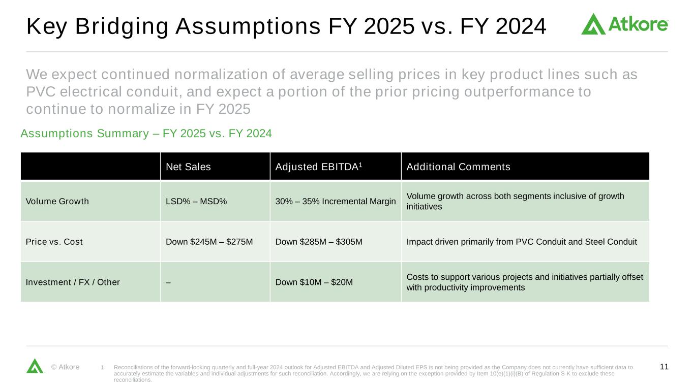 10© Atkore Initial FY 2025 Outlook Outlook Summary 1. Reconciliations of the forward-looking quarterly and full-year 2025 outlook for Adjusted EBITDA and Adjusted Diluted EPS is not being provided as the Company does not currently have sufficient data to accurately estimate the variables and individual adjustments for such reconciliation. Accordingly, we are relying on the exception provided by Item 10(e)(1)(i)(B) of Regulation S-K to exclude these reconciliations. 2. Represents weighted-average shares outstanding in millions used in calculation of Adjusted Diluted EPS outlook. Outlook Items for Consolidated Atkore Q1 2025 Outlook FY 2025 Outlook FY 2025 Comments & Perspective Net Sales $655M – $705M $2.9B – $3.2B • FY 2025 Outlook may vary materially due to changes in assumptions, or economic/market conditions Adjusted EBITDA1 $95M – $105M $475M – $525M Adjusted Diluted EPS1 $1.45 – $1.65 $7.80 – $8.90 Interest Expense ~$38M – $42M Tax Rate ~24% – 26% Capital Expenditures $100M – $125M Share Repurchases ≥$150M Diluted Shares Outstanding2 33M – 35M Initial FY 2025 Outlook underpinned by anticipated low to mid single digit percentage volume growth in FY 2025 driven by projected growth across all key product areas