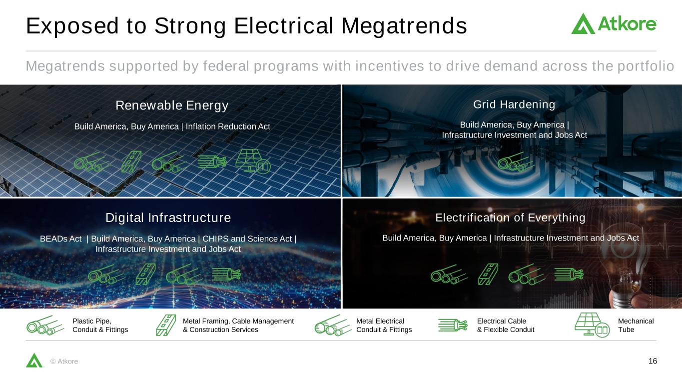 15© Atkore Plastic Pipe, Conduit & Fittings Focused on expanding presence in water-related end markets for PVC and HDPE Solid growth expectations for FY 2025 despite ongoing softness in telecom market Capacity additions by new and existing market participants Key end markets: Utility, municipal and plumbing, residential Metal Framing, Cable Management & Construction Services Investing to support global megaprojects leveraging our construction services business Anticipate growth driven by global megaprojects in FY 2025 Key end markets: Data centers, industrial, commercial, warehouses Metal Electrical Conduit & Fittings Anticipate ongoing import challenges in steel conduit Key end markets: Data centers, commercial Electrical Cable & Flexible Conduit Expect moderate growth in FY 2025 Capacity additions by new and existing market participants Key end markets: Multi-family, commercial Mechanical Tube & Other Inflation Reduction Act (IRA) tax credits for domestic solar torque tubes to continue limiting import opportunities and incentivizing domestic production Key end markets: Utility scale solar projects through OEM Portfolio Updates Atkore’s extensive portfolio supports growth across diverse construction end markets and electrification megatrends; Regional Service Centers and co-load capabilities provide additional value unmatched in the industry Key Product Area Key Portfolio Updates