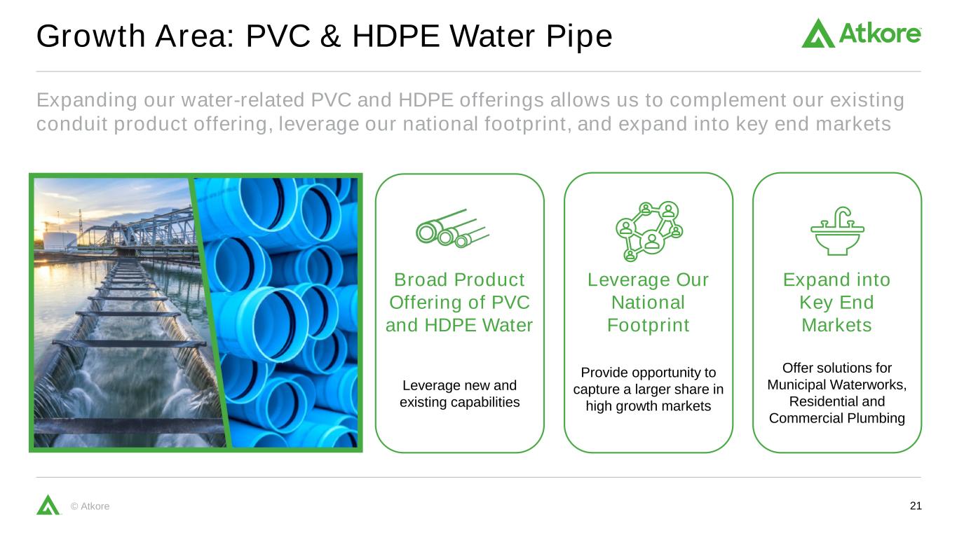 21© Atkore Expanding our water-related PVC and HDPE offerings allows us to complement our existing conduit product offering, leverage our national footprint, and expand into key end markets Growth Area: PVC & HDPE Water Pipe Expand into Key End Markets Leverage Our National Footprint Broad Product Offering of PVC and HDPE Water Provide opportunity to capture a larger share in high growth markets Offer solutions for Municipal Waterworks, Residential and Commercial Plumbing Leverage new and existing capabilities
