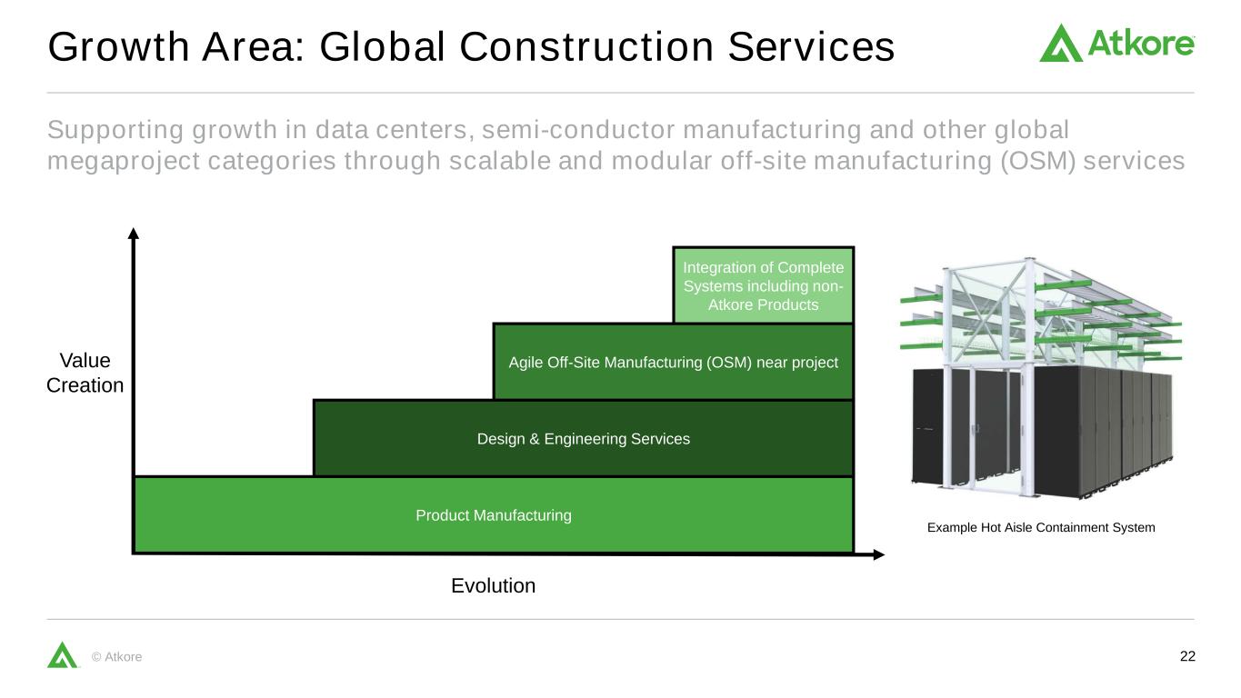 22© Atkore Growth Area: Global Construction Services Supporting growth in data centers, semi-conductor manufacturing and other global megaproject categories through scalable and modular off-site manufacturing (OSM) services Example Hot Aisle Containment System Evolution Value Creation Product Manufacturing Product Manufacturing Design & Engineering Services Product Manufacturing Design & Engineering Services Agile Off-Site Manufacturing Near Project Integration of Complete Systems including non- Atkore Products Product Manufacturing Design & Engineering Services Agile Off-Site Manufacturing (OSM) near project