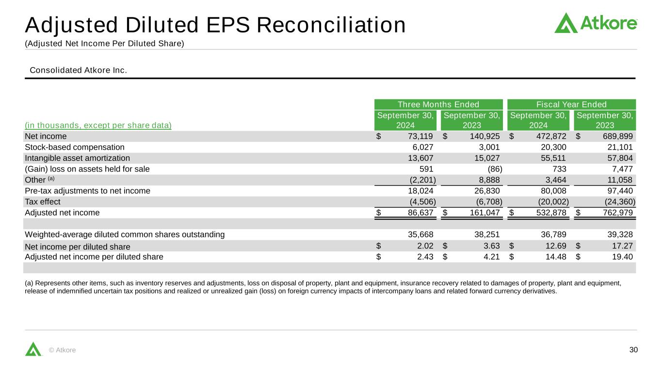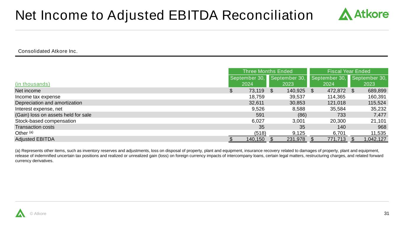 30© Atkore Adjusted Diluted EPS Reconciliation (Adjusted Net Income Per Diluted Share) Consolidated Atkore Inc. Three Months Ended Fiscal Year Ended (in thousands, except per share data) September 30, 2024 September 30, 2023 September 30, 2024 September 30, 2023 Net income $ 73,119 $ 140,925 $ 472,872 $ 689,899 Stock-based compensation 6,027 3,001 20,300 21,101 Intangible asset amortization 13,607 15,027 55,511 57,804 (Gain) loss on assets held for sale 591 (86) 733 7,477 Other (a) (2,201) 8,888 3,464 11,058 Pre-tax adjustments to net income 18,024 26,830 80,008 97,440 Tax effect (4,506) (6,708) (20,002) (24,360) Adjusted net income $ 86,637 $ 161,047 $ 532,878 $ 762,979 Weighted-average diluted common shares outstanding 35,668 38,251 36,789 39,328 Net income per diluted share $ 2.02 $ 3.63 $ 12.69 $ 17.27 Adjusted net income per diluted share $ 2.43 $ 4.21 $ 14.48 $ 19.40 (a) Represents other items, such as inventory reserves and adjustments, loss on disposal of property, plant and equipment, insurance recovery related to damages of property, plant and equipment, release of indemnified uncertain tax positions and realized or unrealized gain (loss) on foreign currency impacts of intercompany loans and related forward currency derivatives.