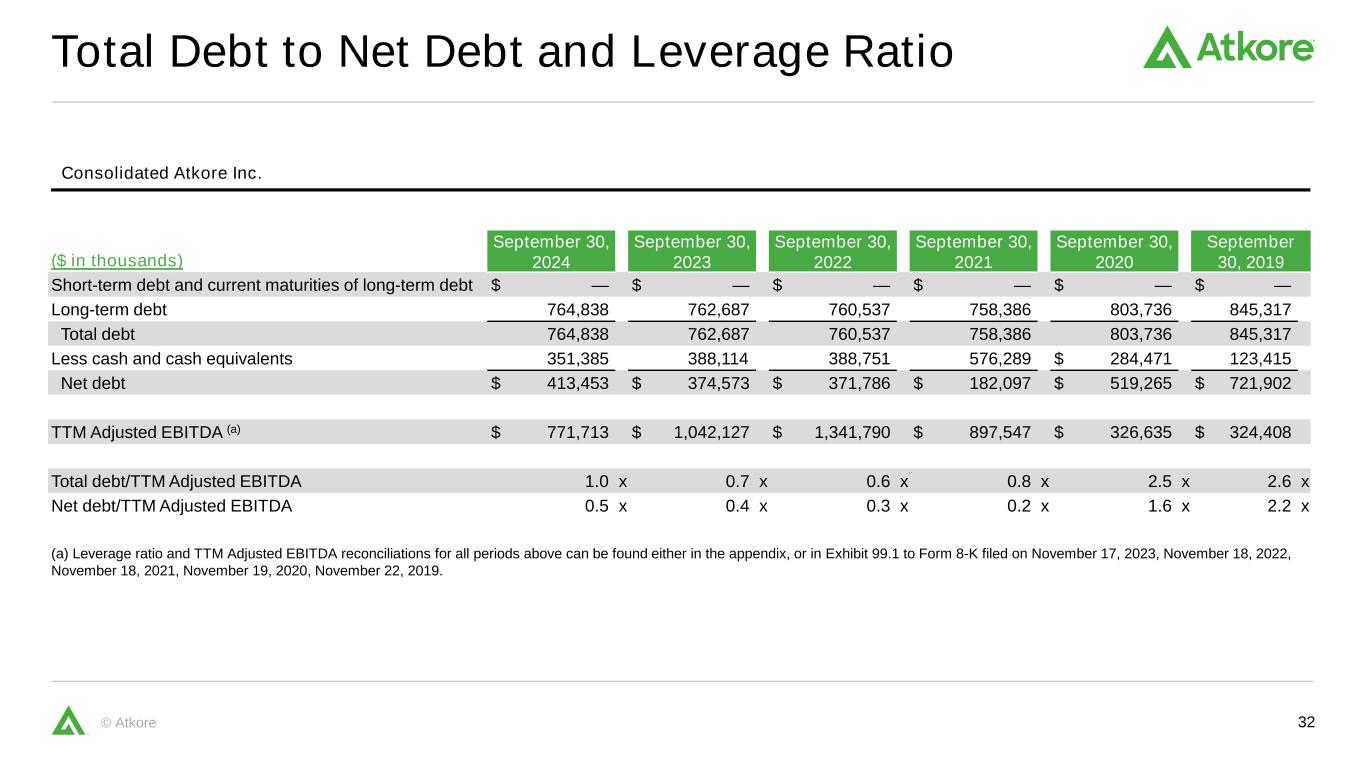 31© Atkore Net Income to Adjusted EBITDA Reconciliation Consolidated Atkore Inc. Three Months Ended Fiscal Year Ended (in thousands) September 30, 2024 September 30, 2023 September 30, 2024 September 30, 2023 Net income $ 73,119 $ 140,925 $ 472,872 $ 689,899 Income tax expense 18,759 39,537 114,365 160,391 Depreciation and amortization 32,611 30,853 121,018 115,524 Interest expense, net 9,526 8,588 35,584 35,232 (Gain) loss on assets held for sale 591 (86) 733 7,477 Stock-based compensation 6,027 3,001 20,300 21,101 Transaction costs 35 35 140 968 Other (a) (518) 9,125 6,701 11,535 Adjusted EBITDA $ 140,150 $ 231,978 $ 771,713 $ 1,042,127 (a) Represents other items, such as inventory reserves and adjustments, loss on disposal of property, plant and equipment, insurance recovery related to damages of property, plant and equipment, release of indemnified uncertain tax positions and realized or unrealized gain (loss) on foreign currency impacts of intercompany loans, certain legal matters, restructuring charges, and related forward currency derivatives.