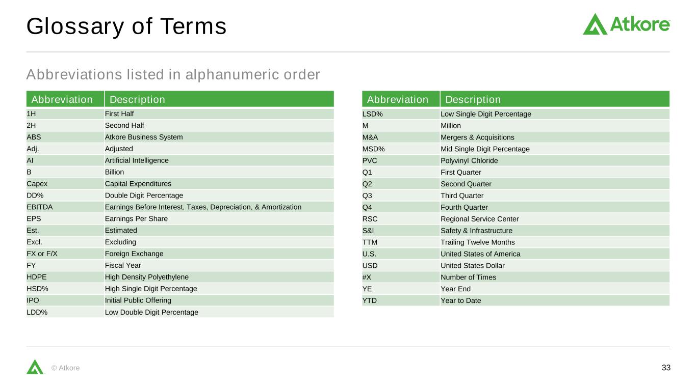 33© Atkore Abbreviations listed in alphanumeric order Glossary of Terms Abbreviation Description 1H First Half 2H Second Half ABS Atkore Business System Adj. Adjusted AI Artificial Intelligence B Billion Capex Capital Expenditures DD% Double Digit Percentage EBITDA Earnings Before Interest, Taxes, Depreciation, & Amortization EPS Earnings Per Share Est. Estimated Excl. Excluding FX or F/X Foreign Exchange FY Fiscal Year HDPE High Density Polyethylene HSD% High Single Digit Percentage IPO Initial Public Offering LDD% Low Double Digit Percentage Abbreviation Description LSD% Low Single Digit Percentage M Million M&A Mergers & Acquisitions MSD% Mid Single Digit Percentage PVC Polyvinyl Chloride Q1 First Quarter Q2 Second Quarter Q3 Third Quarter Q4 Fourth Quarter RSC Regional Service Center S&I Safety & Infrastructure TTM Trailing Twelve Months U.S. United States of America USD United States Dollar #X Number of Times YE Year End YTD Year to Date
