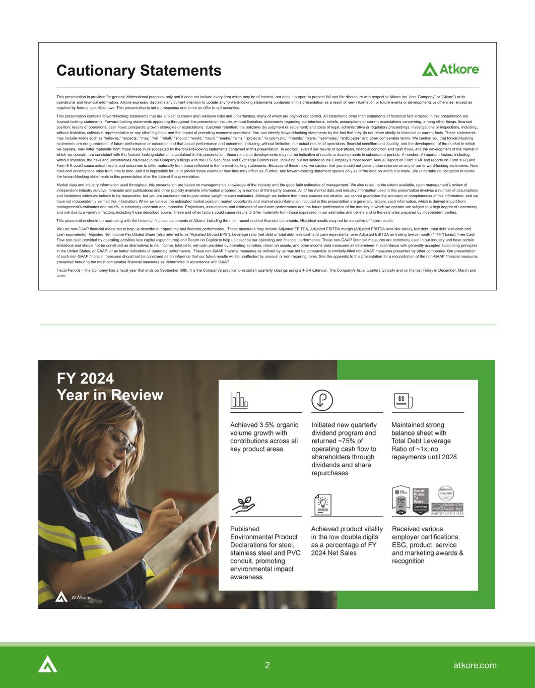 Allied Tube & Conduit Allied Tube & Conduit 2 atkore.com 1© Atkore This presentation is provided for general informational purposes only and it does not include every item which may be of interest, nor does it purport to present full and fair disclosure with respect to Atkore Inc. (the “Company” or “Atkore”) or its operational and financial information. Atkore expressly disclaims any current intention to update any forward-looking statements contained in this presentation as a result of new information or future events or developments or otherwise, except as required by federal securities laws. This presentation is not a prospectus and is not an offer to sell securities. This presentation contains forward-looking statements that are subject to known and unknown risks and uncertainties, many of which are beyond our control. All statements other than statements of historical fact included in this presentation are forward-looking statements. Forward-looking statements appearing throughout this presentation include, without limitation, statements regarding our intentions, beliefs, assumptions or current expectations concerning, among other things, financial position; results of operations; cash flows; prospects; growth strategies or expectations; customer retention; the outcome (by judgment or settlement) and costs of legal, administrative or regulatory proceedings, investigations or inspections, including, without limitation, collective, representative or any other litigation; and the impact of prevailing economic conditions. You can identify forward-looking statements by the fact that they do not relate strictly to historical or current facts. These statements may include words such as “believes,” “expects,” “may,” “will,” “shall,” “should,” “would,” “could,” “seeks,” “aims,” “projects,” “is optimistic,” “intends,” “plans,” “estimates,” “anticipates” and other comparable terms. We caution you that forward-looking statements are not guarantees of future performance or outcomes and that actual performance and outcomes, including, without limitation, our actual results of operations, financial condition and liquidity, and the development of the market in which we operate, may differ materially from those made in or suggested by the forward-looking statements contained in this presentation. In addition, even if our results of operations, financial condition and cash flows, and the development of the market in which we operate, are consistent with the forward-looking statements contained in this presentation, those results or developments may not be indicative of results or developments in subsequent periods. A number of important factors, including, without limitation, the risks and uncertainties disclosed in the Company’s filings with the U.S. Securities and Exchange Commission, including but not limited to the Company’s most recent Annual Report on Form 10-K and reports on Form 10-Q and Form 8-K could cause actual results and outcomes to differ materially from those reflected in the forward-looking statements. Because of these risks, we caution that you should not place undue reliance on any of our forward-looking statements. New risks and uncertainties arise from time to time, and it is impossible for us to predict those events or how they may affect us. Further, any forward-looking statement speaks only as of the date on which it is made. We undertake no obligation to revise the forward-looking statements in this presentation after the date of this presentation. Market data and industry information used throughout this presentation are based on management’s knowledge of the industry and the good faith estimates of management. We also relied, to the extent available, upon management’s review of independent industry surveys, forecasts and publications and other publicly available information prepared by a number of third-party sources. All of the market data and industry information used in this presentation involves a number of assumptions and limitations which we believe to be reasonable, but you are cautioned not to give undue weight to such estimates. Although we believe that these sources are reliable, we cannot guarantee the accuracy or completeness of this information, and we have not independently verified this information. While we believe the estimated market position, market opportunity and market size information included in this presentation are generally reliable, such information, which is derived in part from management’s estimates and beliefs, is inherently uncertain and imprecise. Projections, assumptions and estimates of our future performance and the future performance of the industry in which we operate are subject to a high degree of uncertainty and risk due to a variety of factors, including those described above. These and other factors could cause results to differ materially from those expressed in our estimates and beliefs and in the estimates prepared by independent parties. This presentation should be read along with the historical financial statements of Atkore, including the most recent audited financial statements. Historical results may not be indicative of future results. We use non-GAAP financial measures to help us describe our operating and financial performance. These measures may include Adjusted EBITDA, Adjusted EBITDA margin (Adjusted EBITDA over Net sales), Net debt (total debt less cash and cash equivalents), Adjusted Net Income Per Diluted Share (also referred to as “Adjusted Diluted EPS”), Leverage ratio (net debt or total debt less cash and cash equivalents, over Adjusted EBITDA on trailing twelve month (“TTM”) basis), Free Cash Flow (net cash provided by operating activities less capital expenditures) and Return on Capital to help us describe our operating and financial performance. These non-GAAP financial measures are commonly used in our industry and ha