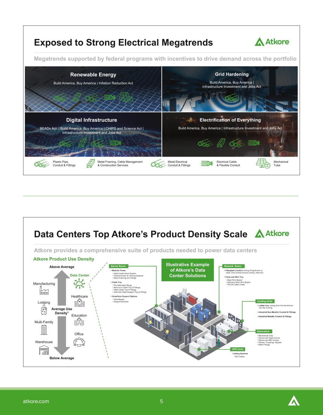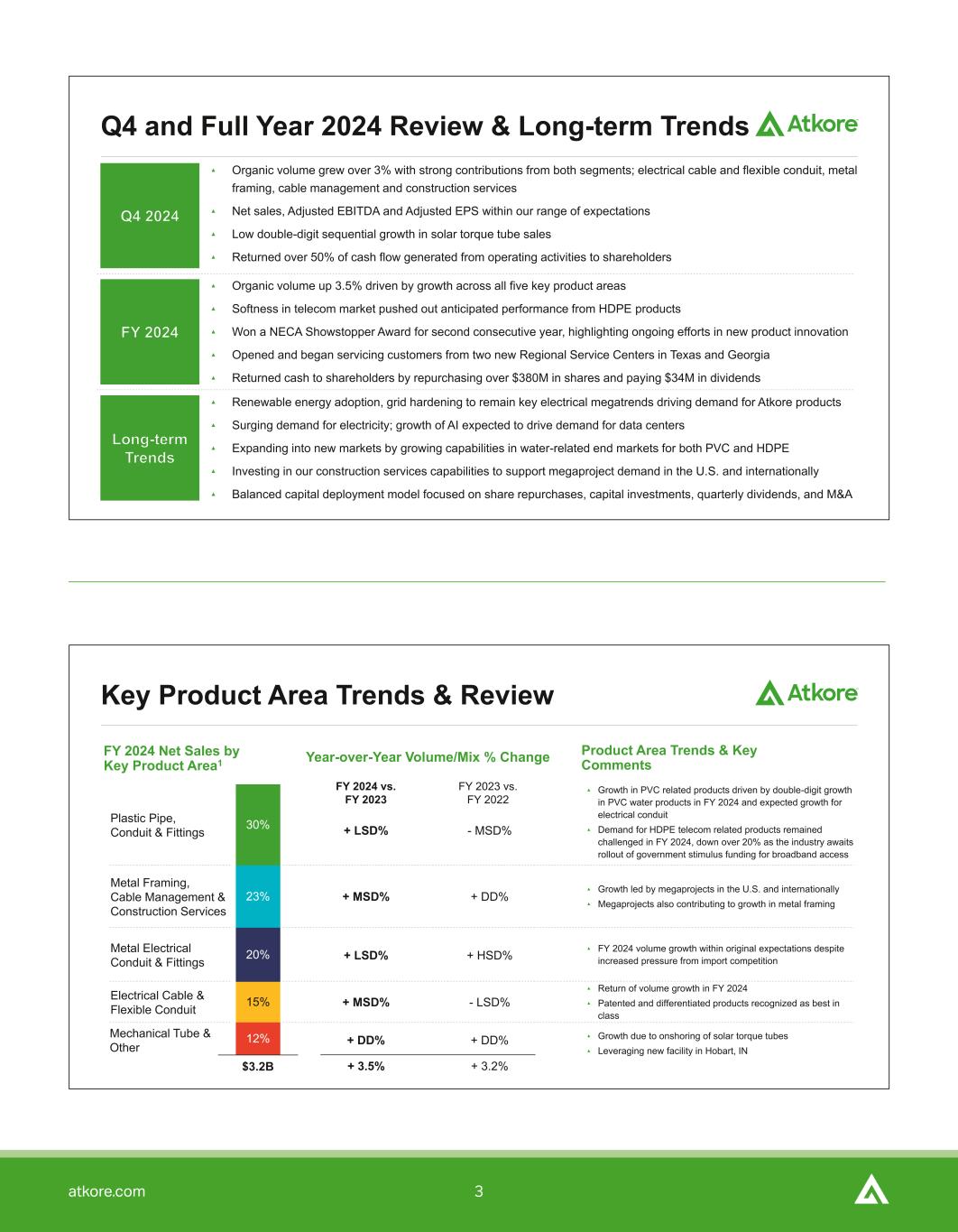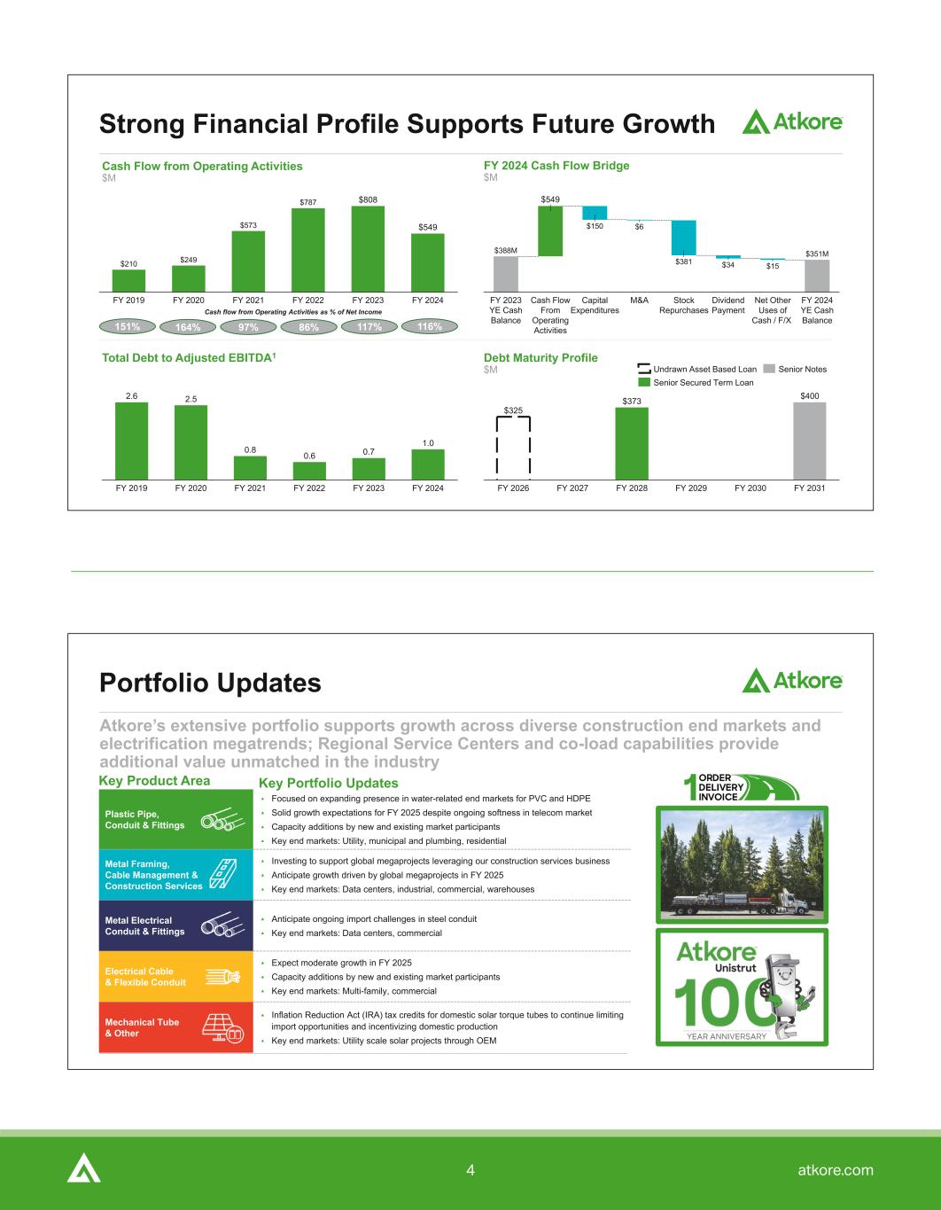 Allied Tube & Conduit Allied Tube & Conduit 3atkore.com 3© Atkore Organic volume grew over 3% with strong contributions from both segments; electrical cable and flexible conduit, metal framing, cable management and construction services Net sales, Adjusted EBITDA and Adjusted EPS within our range of expectations Low double-digit sequential growth in solar torque tube sales Returned over 50% of cash flow generated from operating activities to shareholders Q4 and Full Year 2024 Review & Long-term Trends Q4 2024 FY 2024 Long-term Trends Organic volume up 3.5% driven by growth across all five key product areas Softness in telecom market pushed out anticipated performance from HDPE products Won a NECA Showstopper Award for second consecutive year, highlighting ongoing efforts in new product innovation Opened and began servicing customers from two new Regional Service Centers in Texas and Georgia Returned cash to shareholders by repurchasing over $380M in shares and paying $34M in dividends Renewable energy adoption, grid hardening to remain key electrical megatrends driving demand for Atkore products Surging demand for electricity; growth of AI expected to drive demand for data centers Expanding into new markets by growing capabilities in water-related end markets for both PVC and HDPE Investing in our construction services capabilities to support megaproject demand in the U.S. and internationally Balanced capital deployment model focused on share repurchases, capital investments, quarterly dividends, and M&A 4© Atkore FY 2024 Net Sales by Key Product Area1 Key Product Area Trends & Review 30% 23% 20% 15% 12% $3.2B Plastic Pipe, Conduit & Fittings Metal Framing, Cable Management & Construction Services Metal Electrical Conduit & Fittings Electrical Cable & Flexible Conduit 1. Sales of “Other Electrical products” and “Other Safety & Infrastructure products” have been allocated and included in the presentation of the product area groupings listed for presentation purposes. Source: Management estimates. FY 2024 vs. FY 2023 + LSD% + MSD% + LSD% + MSD% + DD% + 3.5% Mechanical Tube & Other Growth in PVC related products driven by double-digit growth in PVC water products in FY 2024 and expected growth for electrical conduit Demand for HDPE telecom related products remained challenged in FY 2024, down over 20% as the industry awaits rollout of government stimulus funding for broadband access FY 2024 volume growth within original expectations despite increased pressure from import competition Growth led by megaprojects in the U.S. and internationally Megaprojects also contributing to growth in metal framing Return of volume growth in FY 2024 Patented and differentiated products recognized as best in class Growth due to onshoring of solar torque tubes Leveraging new facility in Hobart, IN FY 2023 vs. FY 2022 - MSD% + DD% + HSD% - LSD% + DD% + 3.2% Product Area Trends & Key CommentsYear-over-Year Volume/Mix % Change