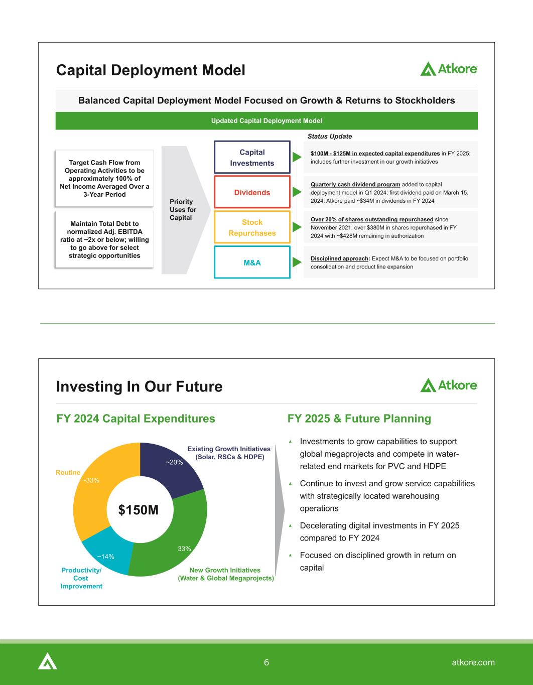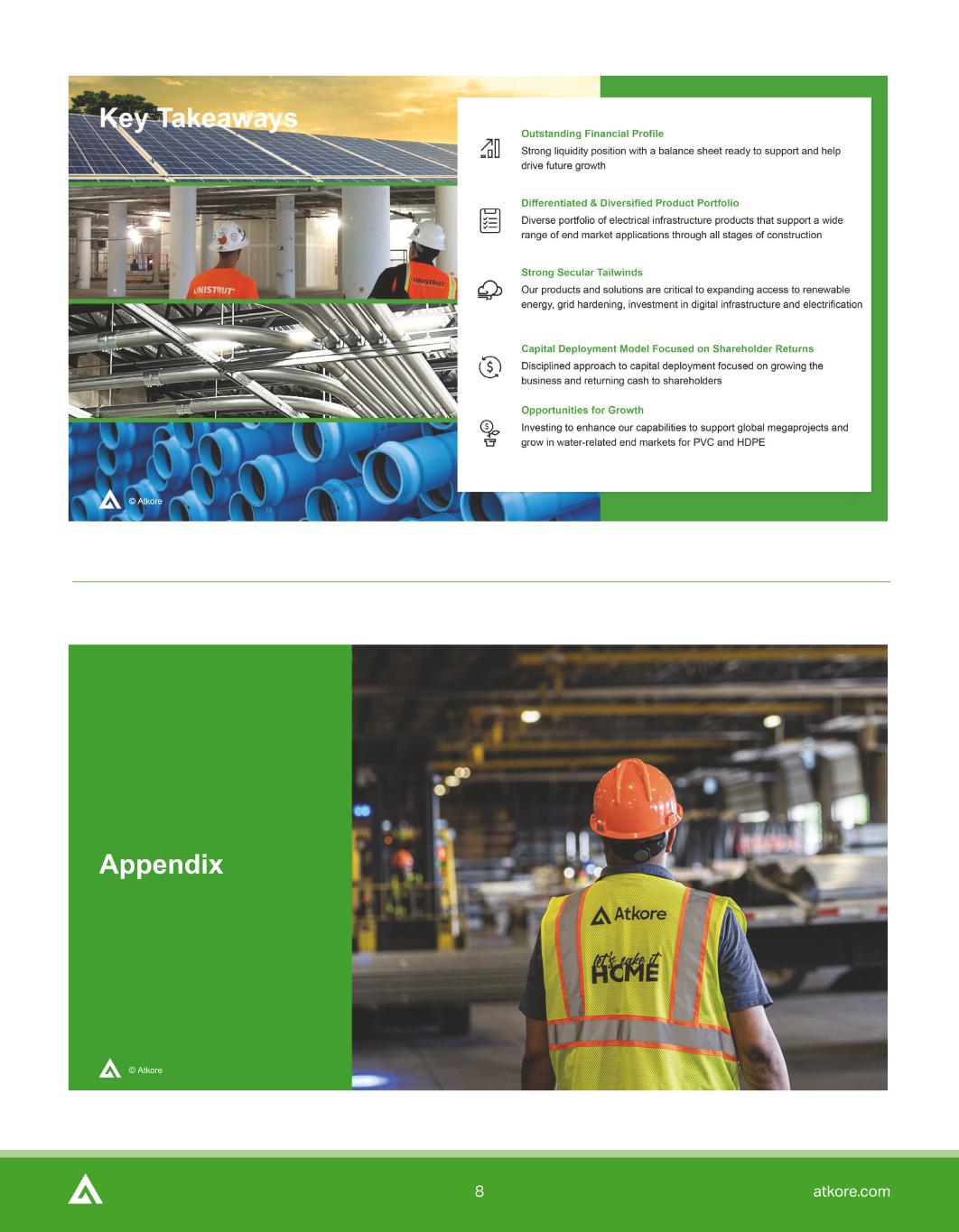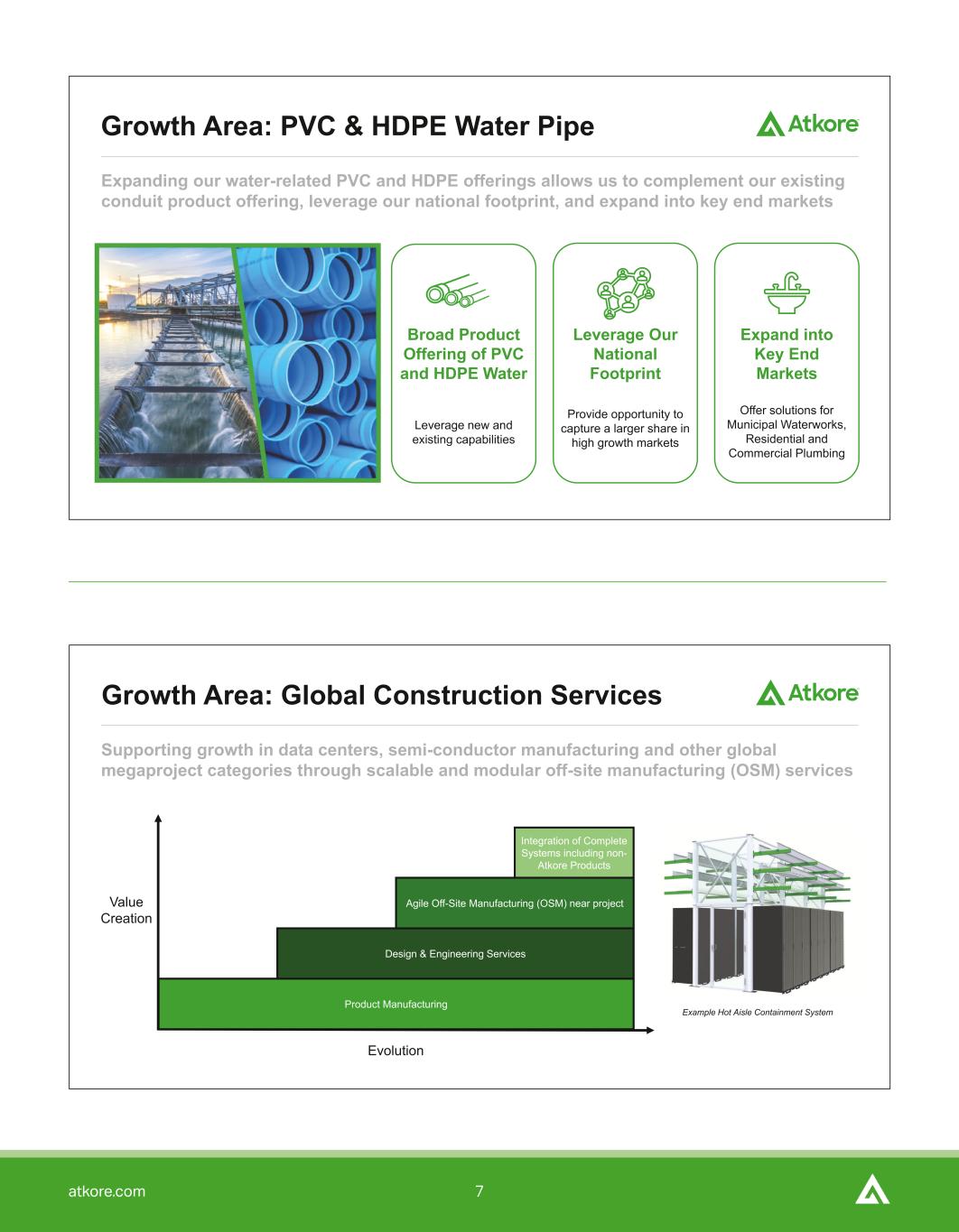 Allied Tube & Conduit Allied Tube & Conduit 4 atkore.com 5© Atkore Cash Flow from Operating Activities $M FY 2024 Cash Flow Bridge $M Strong Financial Profile Supports Future Growth Total Debt to Adjusted EBITDA1 Debt Maturity Profile $M 2.6 2.5 0.8 0.6 0.7 1.0 FY 2019 FY 2020 FY 2021 FY 2022 FY 2023 FY 2024 $325 $373 $400 FY 2026 FY 2027 FY 2028 FY 2029 FY 2030 FY 2031 Undrawn Asset Based Loan Senior Secured Term Loan Senior Notes $210 $249 $573 $787 $808 $549 FY 2019 FY 2020 FY 2021 FY 2022 FY 2023 FY 2024 Cash flow from Operating Activities as % of Net Income $549 $150 $6 $381 $34 $15 FY 2023 YE Cash Balance Cash Flow From Operating Activities Capital Expenditures M&A Stock Repurchases Dividend Payment Net Other Uses of Cash / F/X FY 2024 YE Cash Balance $388M $351M 1. See non-GAAP reconciliation in appendix. 117%86%97%164%151% 116% 6© Atkore Plastic Pipe, Conduit & Fittings Focused on expanding presence in water-related end markets for PVC and HDPE Solid growth expectations for FY 2025 despite ongoing softness in telecom market Capacity additions by new and existing market participants Key end markets: Utility, municipal and plumbing, residential Metal Framing, Cable Management & Construction Services Investing to support global megaprojects leveraging our construction services business Anticipate growth driven by global megaprojects in FY 2025 Key end markets: Data centers, industrial, commercial, warehouses Metal Electrical Conduit & Fittings Anticipate ongoing import challenges in steel conduit Key end markets: Data centers, commercial Electrical Cable & Flexible Conduit Expect moderate growth in FY 2025 Capacity additions by new and existing market participants Key end markets: Multi-family, commercial Mechanical Tube & Other Inflation Reduction Act (IRA) tax credits for domestic solar torque tubes to continue limiting import opportunities and incentivizing domestic production Key end markets: Utility scale solar projects through OEM Portfolio Updates Atkore’s extensive portfolio supports growth across diverse construction end markets and electrification megatrends; Regional Service Centers and co-load capabilities provide additional value unmatched in the industry Key Product Area Key Portfolio Updates