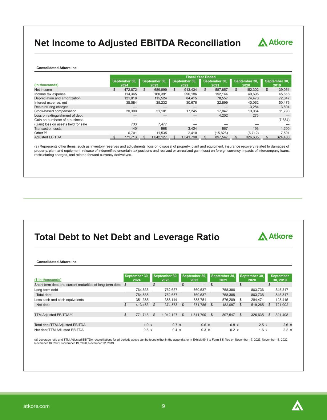 Allied Tube & Conduit Allied Tube & Conduit 9atkore.com 15© Atkore Net Income to Adjusted EBITDA Reconciliation Consolidated Atkore Inc. Fiscal Year Ended (in thousands) September 30, 2024 September 30, 2023 September 30, 2022 September 30, 2021 September 30, 2020 September 30, 2019 Net income $ 472,872 $ 689,899 $ 913,434 $ 587,857 $ 152,302 $ 139,051 Income tax expense 114,365 160,391 290,186 192,144 49,696 45,618 Depreciation and amortization 121,018 115,524 84,415 78,557 74,470 72,347 Interest expense, net 35,584 35,232 30,676 32,899 40,062 50,473 Restructuring charges — — — — 3,284 3,804 Stock-based compensation 20,300 21,101 17,245 17,047 13,064 11,798 Loss on extinguishment of debt — — — 4,202 273 — Gain on purchase of a business — — — — — (7,384) (Gain) loss on assets held for sale 733 7,477 — — — — Transaction costs 140 968 3,424 667 196 1,200 Other (a) 6,701 11,535 2,410 (15,826) (6,712) 7,501 Adjusted EBITDA $ 771,713 $ 1,042,127 $ 1,341,790 $ 897,547 $ 326,635 $ 324,408 (a) Represents other items, such as inventory reserves and adjustments, loss on disposal of property, plant and equipment, insurance recovery related to damages of property, plant and equipment, release of indemnified uncertain tax positions and realized or unrealized gain (loss) on foreign currency impacts of intercompany loans, restructuring charges, and related forward currency derivatives. 16© Atkore Total Debt to Net Debt and Leverage Ratio Consolidated Atkore Inc. ($ in thousands) September 30, 2024 September 30, 2023 September 30, 2022 September 30, 2021 September 30, 2020 September 30, 2019 Short-term debt and current maturities of long-term debt $ — $ — $ — $ — $ — $ — Long-term debt 764,838 762,687 760,537 758,386 803,736 845,317 Total debt 764,838 762,687 760,537 758,386 803,736 845,317 Less cash and cash equivalents 351,385 388,114 388,751 576,289 $ 284,471 123,415 Net debt $ 413,453 $ 374,573 $ 371,786 $ 182,097 $ 519,265 $ 721,902 TTM Adjusted EBITDA (a) $ 771,713 $ 1,042,127 $ 1,341,790 $ 897,547 $ 326,635 $ 324,408 Total debt/TTM Adjusted EBITDA 1.0 x 0.7 x 0.6 x 0.8 x 2.5 x 2.6 x Net debt/TTM Adjusted EBITDA 0.5 x 0.4 x 0.3 x 0.2 x 1.6 x 2.2 x (a) Leverage ratio and TTM Adjusted EBITDA reconciliations for all periods above can be found either in the appendix, or in Exhibit 99.1 to Form 8-K filed on November 17, 2023, November 18, 2022, November 18, 2021, November 19, 2020, November 22, 2019.