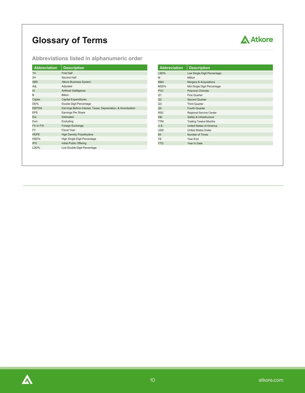 Allied Tube & Conduit 10 atkore.com Allied Tube & Conduit 17© Atkore Abbreviations listed in alphanumeric order Glossary of Terms Abbreviation Description 1H First Half 2H Second Half ABS Atkore Business System Adj. Adjusted AI Artificial Intelligence B Billion Capex Capital Expenditures DD% Double Digit Percentage EBITDA Earnings Before Interest, Taxes, Depreciation, & Amortization EPS Earnings Per Share Est. Estimated Excl. Excluding FX or F/X Foreign Exchange FY Fiscal Year HDPE High Density Polyethylene HSD% High Single Digit Percentage IPO Initial Public Offering LDD% Low Double Digit Percentage Abbreviation Description LSD% Low Single Digit Percentage M Million M&A Mergers & Acquisitions MSD% Mid Single Digit Percentage PVC Polyvinyl Chloride Q1 First Quarter Q2 Second Quarter Q3 Third Quarter Q4 Fourth Quarter RSC Regional Service Center S&I Safety & Infrastructure TTM Trailing Twelve Months U.S. United States of America USD United States Dollar #X Number of Times YE Year End YTD Year to Date