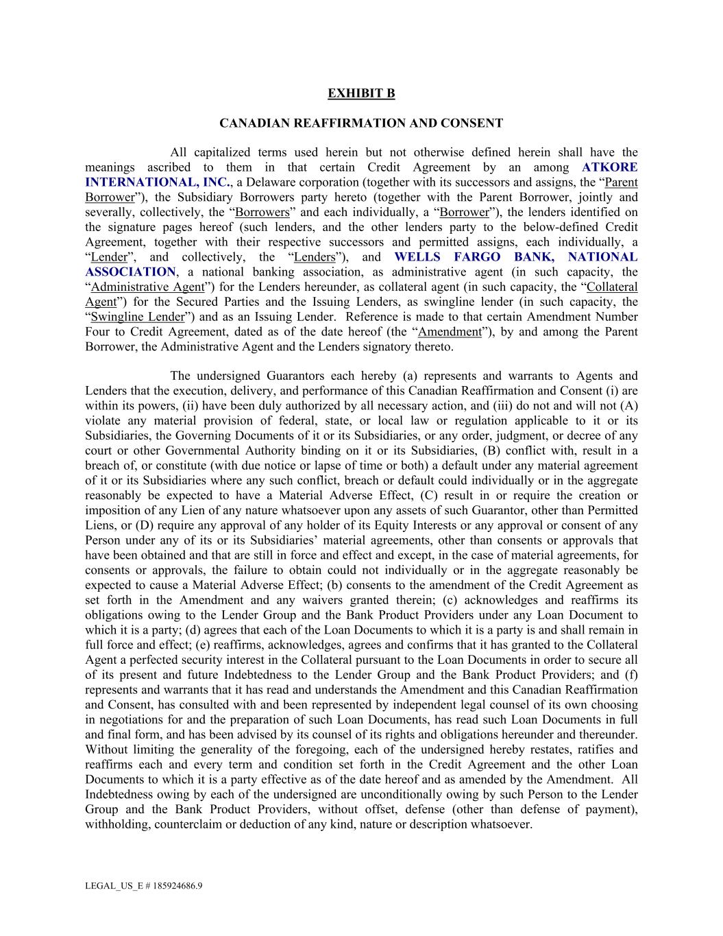 LEGAL_US_E # 185924686.9 EXHIBIT B CANADIAN REAFFIRMATION AND CONSENT All capitalized terms used herein but not otherwise defined herein shall have the meanings ascribed to them in that certain Credit Agreement by an among ATKORE INTERNATIONAL, INC., a Delaware corporation (together with its successors and assigns, the “Parent Borrower”), the Subsidiary Borrowers party hereto (together with the Parent Borrower, jointly and severally, collectively, the “Borrowers” and each individually, a “Borrower”), the lenders identified on the signature pages hereof (such lenders, and the other lenders party to the below-defined Credit Agreement, together with their respective successors and permitted assigns, each individually, a “Lender”, and collectively, the “Lenders”), and WELLS FARGO BANK, NATIONAL ASSOCIATION, a national banking association, as administrative agent (in such capacity, the “Administrative Agent”) for the Lenders hereunder, as collateral agent (in such capacity, the “Collateral Agent”) for the Secured Parties and the Issuing Lenders, as swingline lender (in such capacity, the “Swingline Lender”) and as an Issuing Lender. Reference is made to that certain Amendment Number Four to Credit Agreement, dated as of the date hereof (the “Amendment”), by and among the Parent Borrower, the Administrative Agent and the Lenders signatory thereto. The undersigned Guarantors each hereby (a) represents and warrants to Agents and Lenders that the execution, delivery, and performance of this Canadian Reaffirmation and Consent (i) are within its powers, (ii) have been duly authorized by all necessary action, and (iii) do not and will not (A) violate any material provision of federal, state, or local law or regulation applicable to it or its Subsidiaries, the Governing Documents of it or its Subsidiaries, or any order, judgment, or decree of any court or other Governmental Authority binding on it or its Subsidiaries, (B) conflict with, result in a breach of, or constitute (with due notice or lapse of time or both) a default under any material agreement of it or its Subsidiaries where any such conflict, breach or default could individually or in the aggregate reasonably be expected to have a Material Adverse Effect, (C) result in or require the creation or imposition of any Lien of any nature whatsoever upon any assets of such Guarantor, other than Permitted Liens, or (D) require any approval of any holder of its Equity Interests or any approval or consent of any Person under any of its or its Subsidiaries’ material agreements, other than consents or approvals that have been obtained and that are still in force and effect and except, in the case of material agreements, for consents or approvals, the failure to obtain could not individually or in the aggregate reasonably be expected to cause a Material Adverse Effect; (b) consents to the amendment of the Credit Agreement as set forth in the Amendment and any waivers granted therein; (c) acknowledges and reaffirms its obligations owing to the Lender Group and the Bank Product Providers under any Loan Document to which it is a party; (d) agrees that each of the Loan Documents to which it is a party is and shall remain in full force and effect; (e) reaffirms, acknowledges, agrees and confirms that it has granted to the Collateral Agent a perfected security interest in the Collateral pursuant to the Loan Documents in order to secure all of its present and future Indebtedness to the Lender Group and the Bank Product Providers; and (f) represents and warrants that it has read and understands the Amendment and this Canadian Reaffirmation and Consent, has consulted with and been represented by independent legal counsel of its own choosing in negotiations for and the preparation of such Loan Documents, has read such Loan Documents in full and final form, and has been advised by its counsel of its rights and obligations hereunder and thereunder. Without limiting the generality of the foregoing, each of the undersigned hereby restates, ratifies and reaffirms each and every term and condition set forth in the Credit Agreement and the other Loan Documents to which it is a party effective as of the date hereof and as amended by the Amendment. All Indebtedness owing by each of the undersigned are unconditionally owing by such Person to the Lender Group and the Bank Product Providers, without offset, defense (other than defense of payment), withholding, counterclaim or deduction of any kind, nature or description whatsoever.
