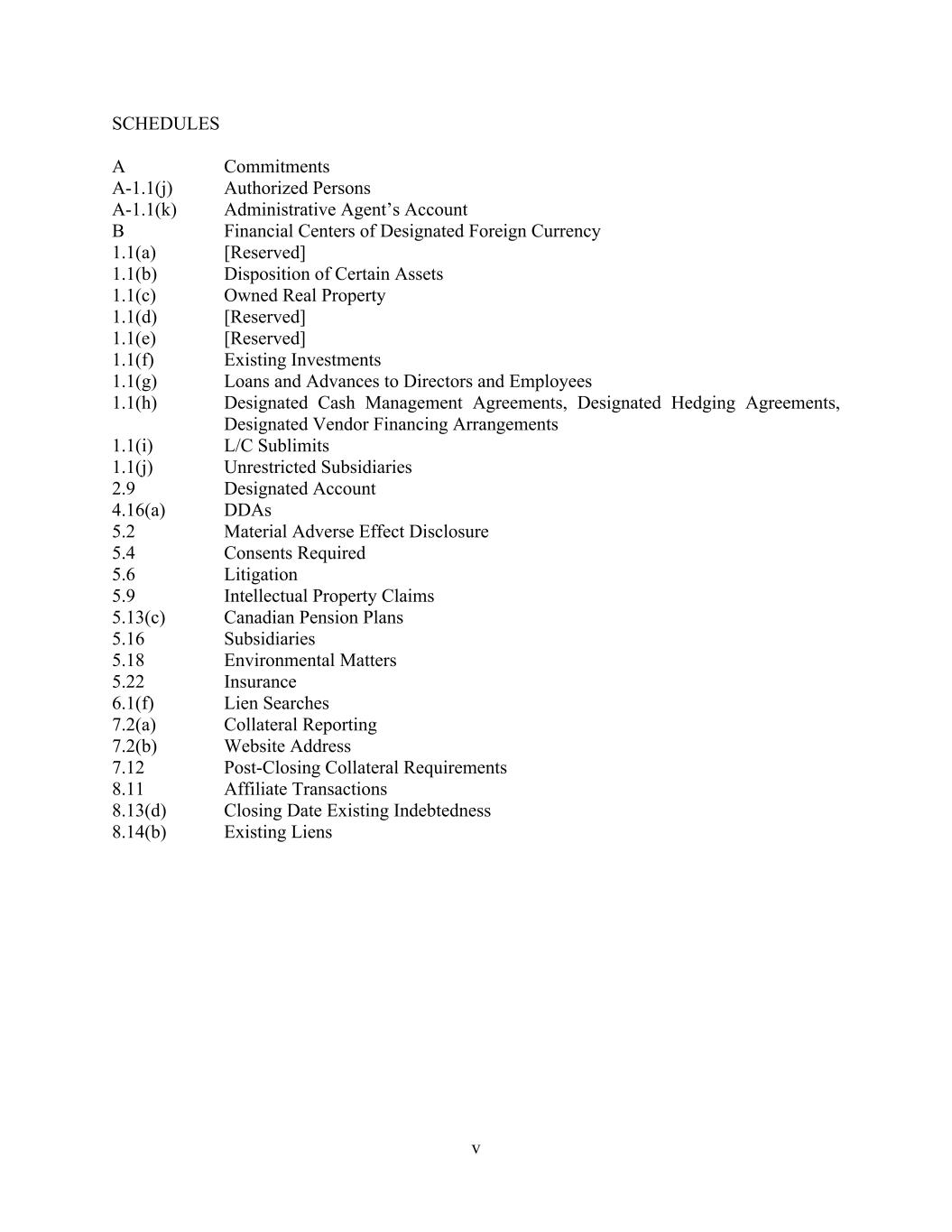 v SCHEDULES A Commitments A-1.1(j) Authorized Persons A-1.1(k) Administrative Agent’s Account B Financial Centers of Designated Foreign Currency 1.1(a) [Reserved] 1.1(b) Disposition of Certain Assets 1.1(c) Owned Real Property 1.1(d) [Reserved] 1.1(e) [Reserved] 1.1(f) Existing Investments 1.1(g) Loans and Advances to Directors and Employees 1.1(h) Designated Cash Management Agreements, Designated Hedging Agreements, Designated Vendor Financing Arrangements 1.1(i) L/C Sublimits 1.1(j) Unrestricted Subsidiaries 2.9 Designated Account 4.16(a) DDAs 5.2 Material Adverse Effect Disclosure 5.4 Consents Required 5.6 Litigation 5.9 Intellectual Property Claims 5.13(c) Canadian Pension Plans 5.16 Subsidiaries 5.18 Environmental Matters 5.22 Insurance 6.1(f) Lien Searches 7.2(a) Collateral Reporting 7.2(b) Website Address 7.12 Post-Closing Collateral Requirements 8.11 Affiliate Transactions 8.13(d) Closing Date Existing Indebtedness 8.14(b) Existing Liens