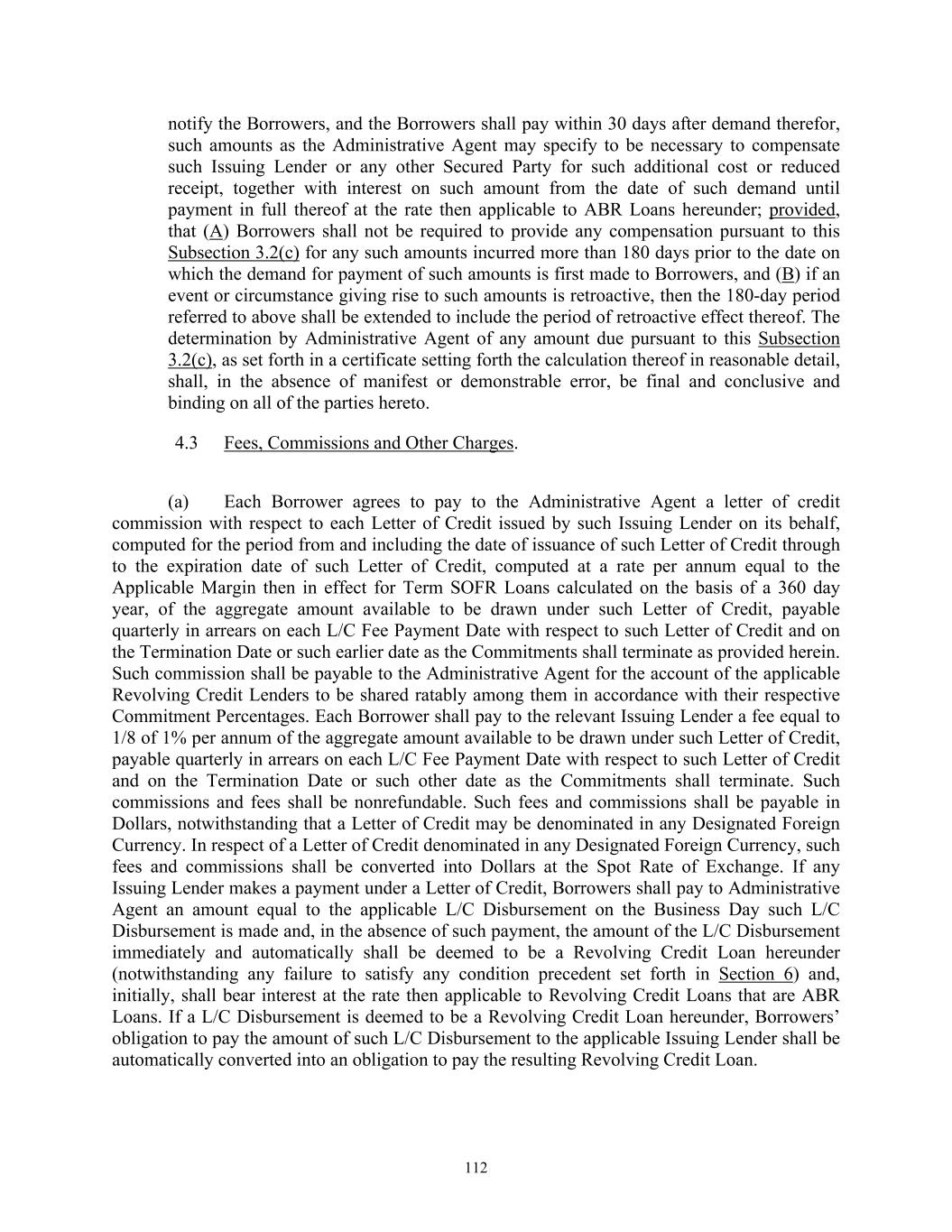 237 Parent Borrower in a notice to the Administrative Agent. Notwithstanding the foregoing, except as provided in clauses (b) and (c) above, the Parent Borrower shall have no obligation under this Subsection 11.5 to any Indemnitee with respect to any tax, levy, impost, duty, charge, fee, deduction or withholding imposed, levied, collected, withheld or assessed by any Governmental Authority. The agreements in this Subsection 11.5 shall survive the termination of this Agreement and the repayment of the Loans and all other amounts payable hereunder (including Obligations with respect to any Letters of Credit that remain outstanding). (b) The liability of Issuing Lender (or any other Letter of Credit Related Person) under, in connection with or arising out of any Letter of Credit (or pre-advice), regardless of the form or legal grounds of the action or proceeding, shall be limited to direct damages suffered by Borrowers that are caused directly by Issuing Lender’s gross negligence or willful misconduct in (i) honoring a presentation under a Letter of Credit that on its face does not at least substantially comply with the terms and conditions of such Letter of Credit, (ii) failing to honor a presentation under a Letter of Credit that strictly complies with the terms and conditions of such Letter of Credit, or (iii) retaining Drawing Documents presented under a Letter of Credit. Borrowers’ aggregate remedies against Issuing Lender and any Letter of Credit Related Person for wrongfully honoring a presentation under any Letter of Credit or wrongfully retaining honored Drawing Documents shall in no event exceed the aggregate amount paid by Borrowers to Issuing Lender in respect of the honored presentation in connection with such Letter of Credit under Section 3.2(a), plus interest at the rate then applicable to ABR Loans hereunder. Borrowers shall take action to avoid and mitigate the amount of any damages claimed against Issuing Lender or any other Letter of Credit Related Person, including by enforcing its rights against the beneficiaries of the Letters of Credit. Any claim by Borrowers under or in connection with any Letter of Credit shall be reduced by an amount equal to the sum of (x) the amount (if any) saved by Borrowers as a result of the breach or alleged wrongful conduct complained of, and (y) the amount (if any) of the loss that would have been avoided had Borrowers taken all reasonable steps to mitigate any loss, and in case of a claim of wrongful dishonor, by specifically and timely authorizing Issuing Lender to effect a cure. (c) Borrowers are responsible for the final text of the Letter of Credit as issued by Issuing Lender, irrespective of any assistance Issuing Lender may provide such as drafting or recommending text or by Issuing Lender’s use or refusal to use text submitted by Borrowers. Borrowers understand that the final form of any Letter of Credit may be subject to such revisions and changes as are deemed necessary or appropriate by Issuing Lender, and Borrowers hereby consent to such revisions and changes not materially different from the application executed in connection therewith. Borrowers are solely responsible for the suitability of the Letter of Credit for Borrowers’ purposes. If Borrowers request Issuing Lender to issue a Letter of Credit for an affiliated or unaffiliated third party (an “Account Party”), (i) such Account Party shall have no rights against Issuing Lender; (ii) Borrowers shall be responsible for the application and obligations under this Agreement; and (iii) communications (including notices) related to the respective Letter of Credit shall be among Issuing Lender and the Borrower Representative. Borrowers will examine the copy of the Letter of Credit and any other documents sent by Issuing Lender in connection therewith and shall promptly notify Issuing Lender (not later than three (3) Business Days following Borrowers’ receipt of documents from Issuing Lender) of any non-