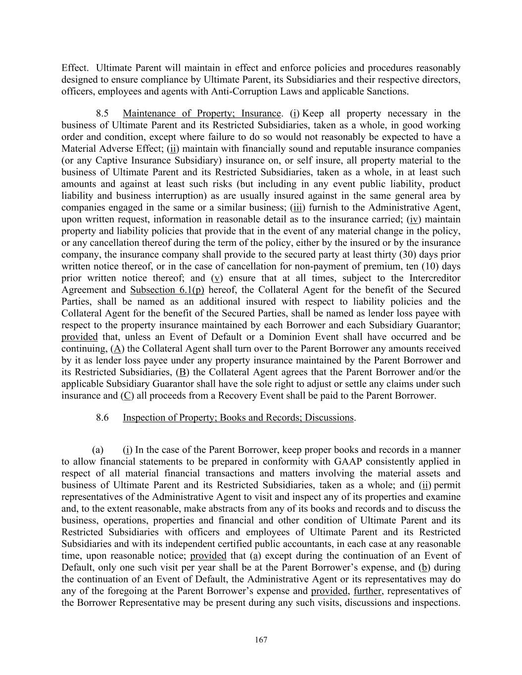 167 Effect. Ultimate Parent will maintain in effect and enforce policies and procedures reasonably designed to ensure compliance by Ultimate Parent, its Subsidiaries and their respective directors, officers, employees and agents with Anti-Corruption Laws and applicable Sanctions. 8.5 Maintenance of Property; Insurance. (i) Keep all property necessary in the business of Ultimate Parent and its Restricted Subsidiaries, taken as a whole, in good working order and condition, except where failure to do so would not reasonably be expected to have a Material Adverse Effect; (ii) maintain with financially sound and reputable insurance companies (or any Captive Insurance Subsidiary) insurance on, or self insure, all property material to the business of Ultimate Parent and its Restricted Subsidiaries, taken as a whole, in at least such amounts and against at least such risks (but including in any event public liability, product liability and business interruption) as are usually insured against in the same general area by companies engaged in the same or a similar business; (iii) furnish to the Administrative Agent, upon written request, information in reasonable detail as to the insurance carried; (iv) maintain property and liability policies that provide that in the event of any material change in the policy, or any cancellation thereof during the term of the policy, either by the insured or by the insurance company, the insurance company shall provide to the secured party at least thirty (30) days prior written notice thereof, or in the case of cancellation for non-payment of premium, ten (10) days prior written notice thereof; and (v) ensure that at all times, subject to the Intercreditor Agreement and Subsection 6.1(p) hereof, the Collateral Agent for the benefit of the Secured Parties, shall be named as an additional insured with respect to liability policies and the Collateral Agent for the benefit of the Secured Parties, shall be named as lender loss payee with respect to the property insurance maintained by each Borrower and each Subsidiary Guarantor; provided that, unless an Event of Default or a Dominion Event shall have occurred and be continuing, (A) the Collateral Agent shall turn over to the Parent Borrower any amounts received by it as lender loss payee under any property insurance maintained by the Parent Borrower and its Restricted Subsidiaries, (B) the Collateral Agent agrees that the Parent Borrower and/or the applicable Subsidiary Guarantor shall have the sole right to adjust or settle any claims under such insurance and (C) all proceeds from a Recovery Event shall be paid to the Parent Borrower. 8.6 Inspection of Property; Books and Records; Discussions. (a) (i) In the case of the Parent Borrower, keep proper books and records in a manner to allow financial statements to be prepared in conformity with GAAP consistently applied in respect of all material financial transactions and matters involving the material assets and business of Ultimate Parent and its Restricted Subsidiaries, taken as a whole; and (ii) permit representatives of the Administrative Agent to visit and inspect any of its properties and examine and, to the extent reasonable, make abstracts from any of its books and records and to discuss the business, operations, properties and financial and other condition of Ultimate Parent and its Restricted Subsidiaries with officers and employees of Ultimate Parent and its Restricted Subsidiaries and with its independent certified public accountants, in each case at any reasonable time, upon reasonable notice; provided that (a) except during the continuation of an Event of Default, only one such visit per year shall be at the Parent Borrower’s expense, and (b) during the continuation of an Event of Default, the Administrative Agent or its representatives may do any of the foregoing at the Parent Borrower’s expense and provided, further, representatives of the Borrower Representative may be present during any such visits, discussions and inspections.