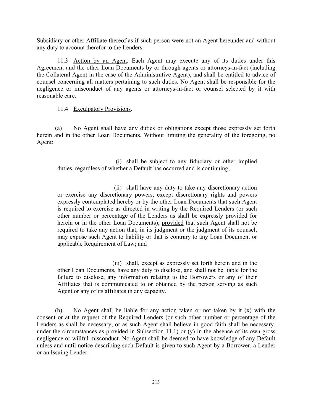213 Subsidiary or other Affiliate thereof as if such person were not an Agent hereunder and without any duty to account therefor to the Lenders. 11.3 Action by an Agent. Each Agent may execute any of its duties under this Agreement and the other Loan Documents by or through agents or attorneys-in-fact (including the Collateral Agent in the case of the Administrative Agent), and shall be entitled to advice of counsel concerning all matters pertaining to such duties. No Agent shall be responsible for the negligence or misconduct of any agents or attorneys-in-fact or counsel selected by it with reasonable care. 11.4 Exculpatory Provisions. (a) No Agent shall have any duties or obligations except those expressly set forth herein and in the other Loan Documents. Without limiting the generality of the foregoing, no Agent: (i) shall be subject to any fiduciary or other implied duties, regardless of whether a Default has occurred and is continuing; (ii) shall have any duty to take any discretionary action or exercise any discretionary powers, except discretionary rights and powers expressly contemplated hereby or by the other Loan Documents that such Agent is required to exercise as directed in writing by the Required Lenders (or such other number or percentage of the Lenders as shall be expressly provided for herein or in the other Loan Documents); provided that such Agent shall not be required to take any action that, in its judgment or the judgment of its counsel, may expose such Agent to liability or that is contrary to any Loan Document or applicable Requirement of Law; and (iii) shall, except as expressly set forth herein and in the other Loan Documents, have any duty to disclose, and shall not be liable for the failure to disclose, any information relating to the Borrowers or any of their Affiliates that is communicated to or obtained by the person serving as such Agent or any of its affiliates in any capacity. (b) No Agent shall be liable for any action taken or not taken by it (x) with the consent or at the request of the Required Lenders (or such other number or percentage of the Lenders as shall be necessary, or as such Agent shall believe in good faith shall be necessary, under the circumstances as provided in Subsection 11.1) or (y) in the absence of its own gross negligence or willful misconduct. No Agent shall be deemed to have knowledge of any Default unless and until notice describing such Default is given to such Agent by a Borrower, a Lender or an Issuing Lender.