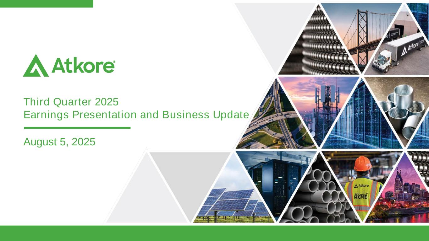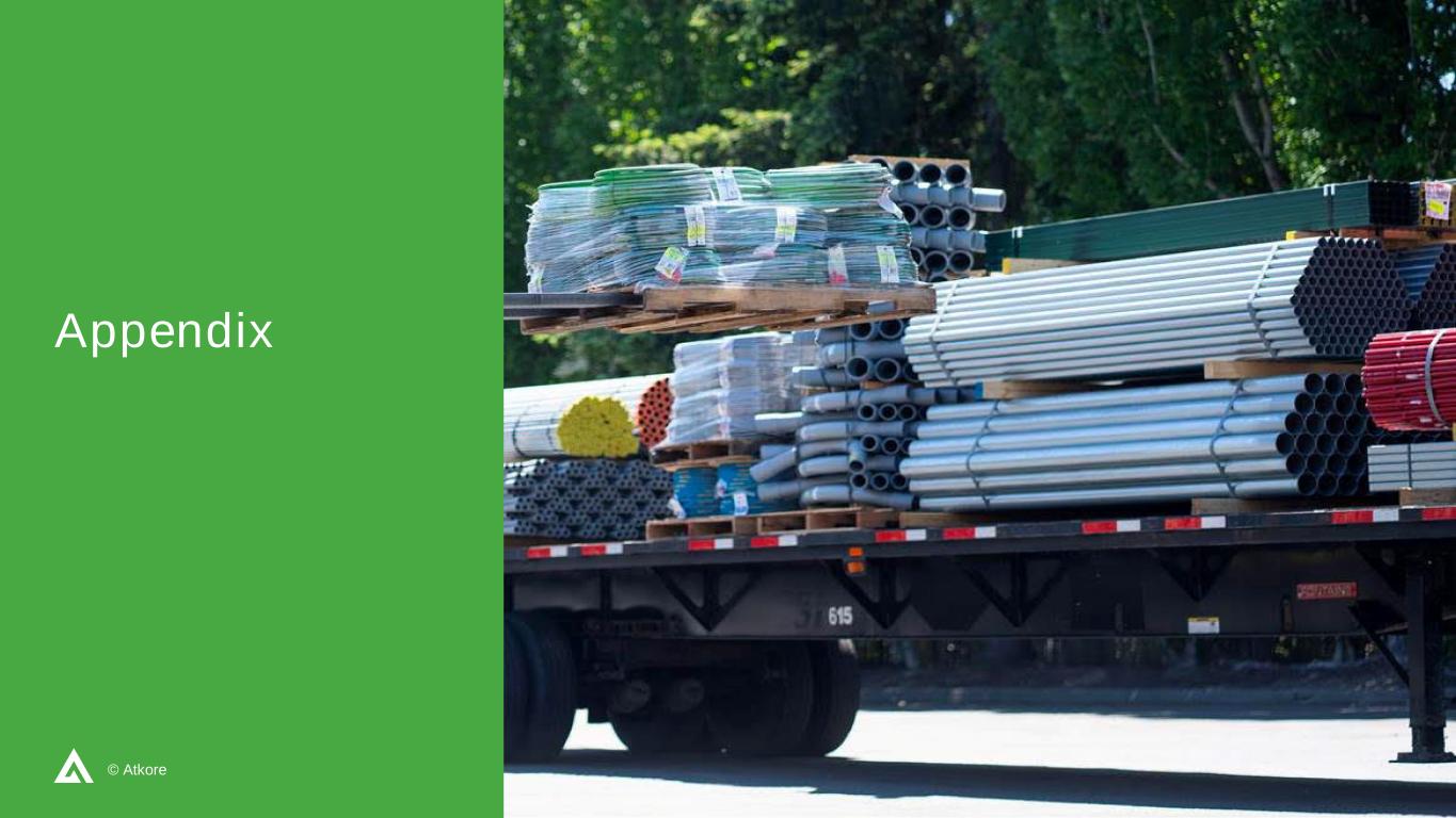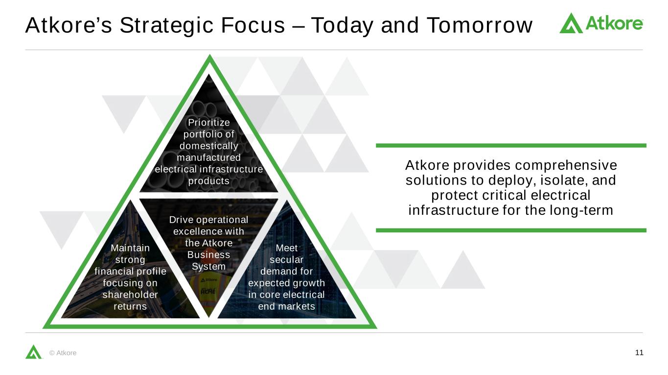 2© Atkore This presentation is provided for general informational purposes only and it does not include every item which may be of interest, nor does it purport to present full and fair disclosure with respect to Atkore Inc. (the “Company” or “Atkore”) or its operational and financial information. Atkore expressly disclaims any current intention to update any forward-looking statements contained in this presentation as a result of new information or future events or developments or otherwise, except as required by federal securities laws. This presentation is not a prospectus and is not an offer to sell securities. This presentation contains forward-looking statements that are subject to known and unknown risks and uncertainties, many of which are beyond our control. All statements other than statements of historical fact included in this presentation are forward-looking statements. Forward-looking statements appearing throughout this presentation include, without limitation, statements regarding our intentions, beliefs, assumptions or current expectations concerning, among other things, financial position; results of operations; cash flows; prospects; growth strategies or expectations; customer retention; the outcome (by judgment or settlement) and costs of legal, administrative or regulatory proceedings, investigations or inspections, including, without limitation, collective, representative or any other litigation; and the impact of prevailing economic conditions. You can identify forward-looking statements by the fact that they do not relate strictly to historical or current facts. These statements may include words such as “believes,” “expects,” “may,” “will,” “shall,” “should,” “would,” “could,” “seeks,” “aims,” “projects,” “is optimistic,” “intends,” “plans,” “estimates,” “anticipates” and other comparable terms. We caution you that forward-looking statements are not guarantees of future performance or outcomes and that actual performance and outcomes, including, without limitation, our actual results of operations, financial condition and liquidity, and the development of the market in which we operate, may differ materially from those made in or suggested by the forward-looking statements contained in this presentation. In addition, even if our results of operations, financial condition and cash flows, and the development of the market in which we operate, are consistent with the forward-looking statements contained in this presentation, those results or developments may not be indicative of results or developments in subsequent periods. A number of important factors, including, without limitation, the risks and uncertainties disclosed in the Company’s filings with the U.S. Securities and Exchange Commission, including but not limited to the Company’s most recent Annual Report on Form 10-K and reports on Form 10-Q and Form 8-K could cause actual results and outcomes to differ materially from those reflected in the forward-looking statements. Because of these risks, we caution that you should not place undue reliance on any of our forward-looking statements. New risks and uncertainties arise from time to time, and it is impossible for us to predict those events or how they may affect us. Further, any forward-looking statement speaks only as of the date on which it is made. We undertake no obligation to revise the forward-looking statements in this presentation after the date of this presentation. Market data and industry information used throughout this presentation are based on management’s knowledge of the industry and the good faith estimates of management. We also relied, to the extent available, upon management’s review of independent industry surveys, forecasts and publications and other publicly available information prepared by a number of third-party sources. All of the market data and industry information used in this presentation involves a number of assumptions and limitations which we believe to be reasonable, but you are cautioned not to give undue weight to such estimates. Although we believe that these sources are reliable, we cannot guarantee the accuracy or completeness of this information, and we have not independently verified this information. While we believe the estimated market position, market opportunity and market size information included in this presentation are generally reliable, such information, which is derived in part from management’s estimates and beliefs, is inherently uncertain and imprecise. Projections, assumptions and estimates of our future performance and the future performance of the industry in which we operate are subject to a high degree of uncertainty and risk due to a variety of factors, including those described above. These and other factors could cause results to differ materially from those expressed in our estimates and beliefs and in the estimates prepared by independent parties. This presentation should be read along with the historical financial statements of Atkore, including the most recent audited financial statements. Historical results may not be indicative of future results. We use non-GAAP financial measures to help us describe our operating and financial performance. These measures may include Adjusted EBITDA, Adjusted EBITDA margin (Adjusted EBITDA over Net sales), Net debt (total debt less cash and cash equivalents), Adjusted Net Income Per Diluted Share (also referred to as “Adjusted Diluted EPS”), Leverage ratio (net debt or total debt less cash and cash equivalents, over Adjusted EBITDA on trailing twelve month (“TTM”) basis), Free Cash Flow (net cash provided by operating activities less capital expenditures) and Return on Capital to help us describe our operating and financial performance. These non-GAAP financial measures are commonly used in our industry and have certain limitations and should not be construed as alt