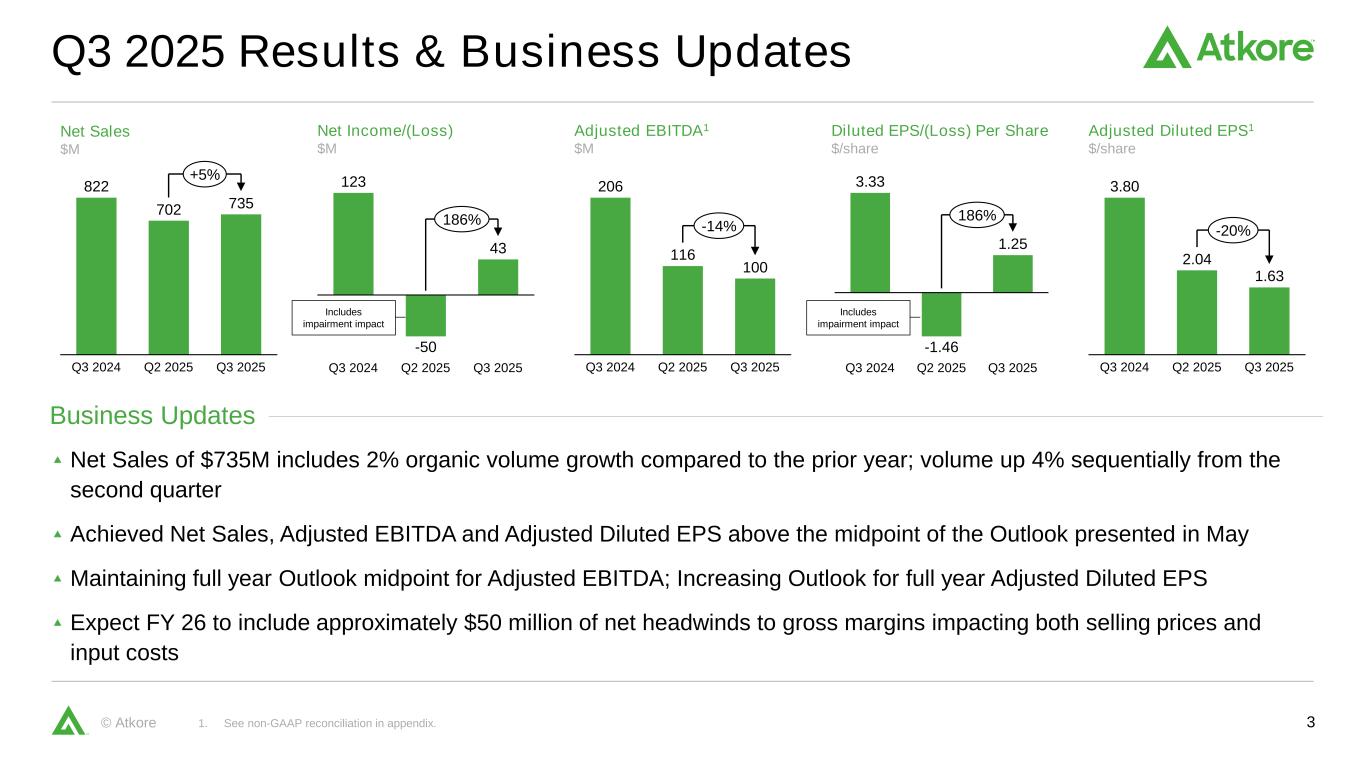 3© Atkore Q3 2025 Results & Business Updates 1. See non-GAAP reconciliation in appendix. 822 702 735 Q3 2024 Q2 2025 Q3 2025 +5% 123 -50 43 Q3 2024 Q2 2025 Q3 2025 186% 206 116 100 Q3 2024 Q2 2025 Q3 2025 -14% 3.80 2.04 1.63 Q3 2024 Q2 2025 Q3 2025 -20% Net Sales $M Net Income/(Loss) $M Adjusted EBITDA1 $M Adjusted Diluted EPS1 $/share 3.33 -1.46 1.25 Q3 2024 Q2 2025 Q3 2025 186% Diluted EPS/(Loss) Per Share $/share Net Sales of $735M includes 2% organic volume growth compared to the prior year; volume up 4% sequentially from the second quarter Achieved Net Sales, Adjusted EBITDA and Adjusted Diluted EPS above the midpoint of the Outlook presented in May Maintaining full year Outlook midpoint for Adjusted EBITDA; Increasing Outlook for full year Adjusted Diluted EPS Expect FY 26 to include approximately $50 million of net headwinds to gross margins impacting both selling prices and input costs Business Updates Includes impairment impact Includes impairment impact
