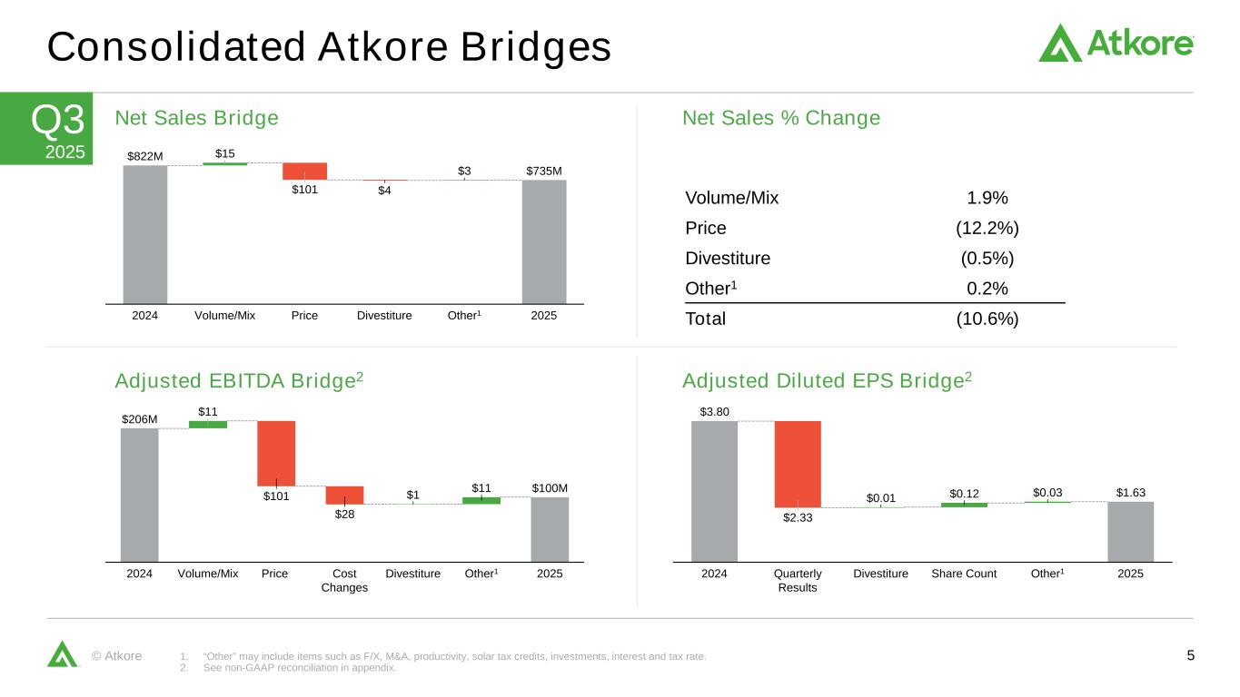 4© Atkore Q3 Income Statement Summary 1. See non-GAAP reconciliation in appendix. 2. Adjusted EBITDA Margin is Adjusted EBITDA as a percentage of Net Sales. ($’s in millions) Q3 2025 Q3 2024 Y/Y Change Y/Y % Change Net Sales $735.0 $822.4 ($87.3) (10.6%) Operating Income $63.8 $168.5 ($104.6) (62.1%) Net (Loss)/Income $43.0 $123.4 ($80.5) (65.2%) Adjusted EBITDA1 $99.9 $206.1 ($106.2) (51.5%) Adjusted EBITDA Margin2 13.6% 25.1% (1150 bps) - Tax Rate 22.0% 21.9% +10 bps - Net (Loss)/Income Per Share (Diluted) $1.25 $3.33 ($2.08) (62.4%) Adjusted Diluted EPS1 $1.63 $3.80 ($2.17) (57.1%)